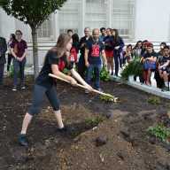 Faculty, staff and the eighth-grade students at I.S. 93 helped throw the dirt on top of the time capsule, sealing it underground for a half century.