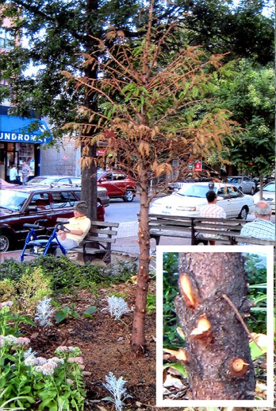 Except for the latest round of vandalism, many residents have wondered why all these trees have died. Many have argued that there is little room for the roots of the tree to grow, claiming that there is cement just a few feet below the tree. But this theory was debunked by the Parks Dept. that said there was gravel there, which allows for adequate growth and soil.