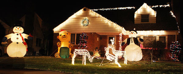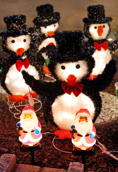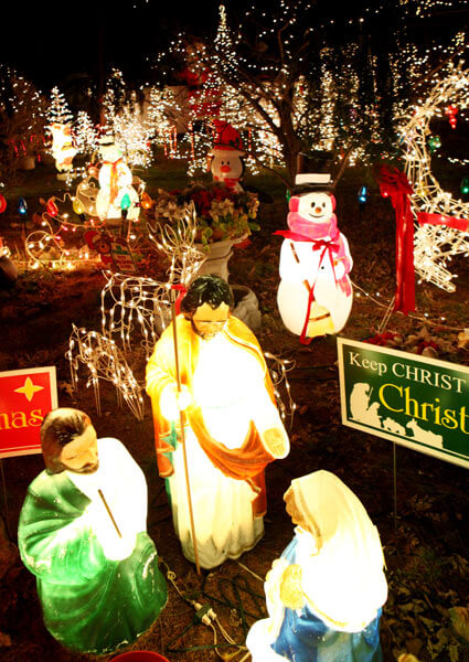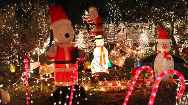 Holiday decorations light up the night.