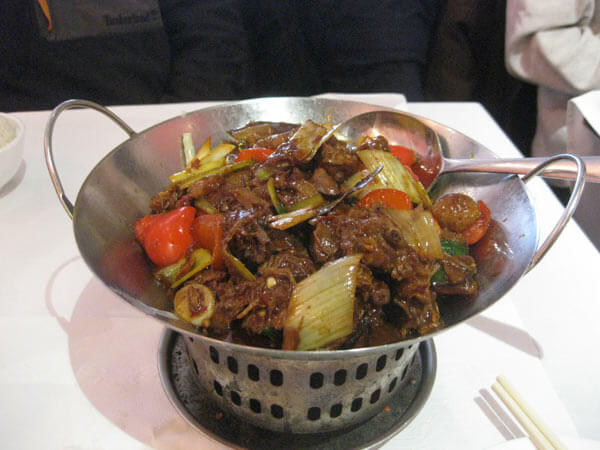 Duck is popular in Hunan. You can order it barbecued, smoked, or in casserole, or opt only for the head or the tongue. The casserole is served in a metal pan over a sterno warmer. The flavors emphasize star anise along with garlic and chilies. We give this high marks for its robust flavor, but must caution that the duck bones are hacked up, and it requires effort to remove the meat from the bones, especially with chopsticks.