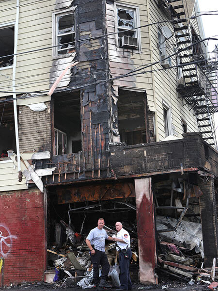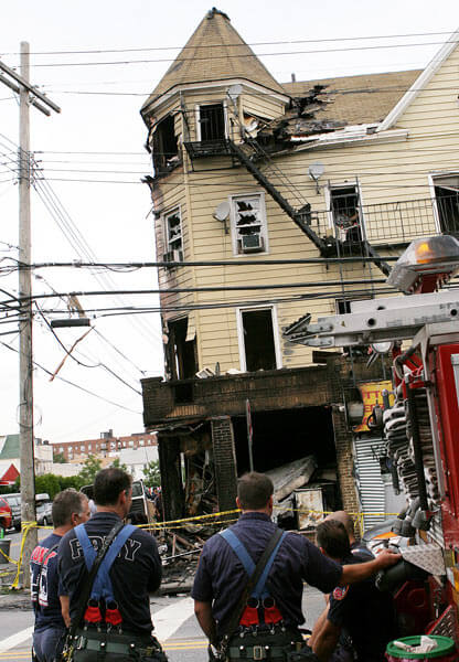 The dozen or so tenants who live in the six apartments in the 3 12/2-story building had to scramble down fire escapes or crawl out windows onto neighboring rooftops to flee the flames. Firefighters from 25 trucks battled the blaze for three hours before it was extinguished, and more than 12 were taken to local hospitals with minor injuries along with two residents of the building, according to Duffy.