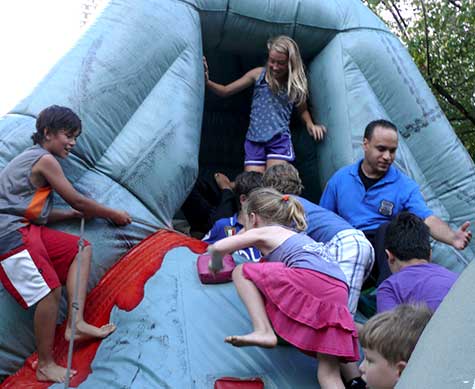 Community Affairs Officer Luis Diaz gives a hand to children atop the rock-climbing inflatable.