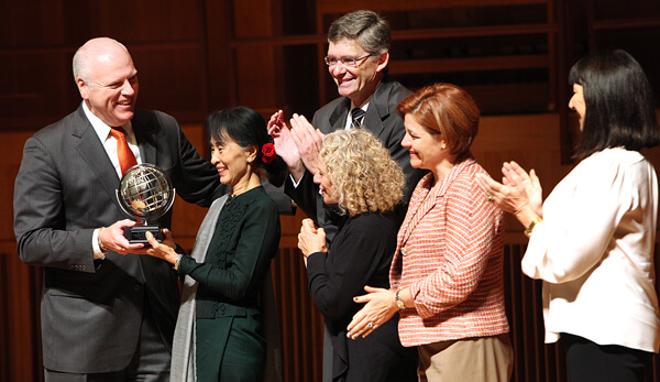 “She always believed in human rights and the rights of people everywhere,” Crowley said of Kyi, whom he referred to as his personal hero. “We are truly in the presence of greatness.”