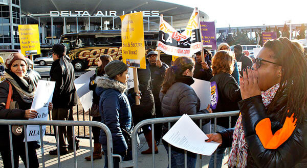 “Air Serv has put our backs against the wall by not addressing our concerns for the public safety by not providing us with enough training or enough proper equipment to do our jobs,” Air Serv employee Prince Jackson said at a rally last week when the workers voted to authorize the strike. “So we have no other choice than to take drastic action and, unfortunately, we will have to if our demands and if our concerns are not met. We will have to strike next week.”