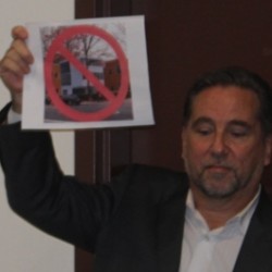 Several Sunnyside residents held up signs that had a picture of the development with a red line drawn through it while Schwarting presented the plan.