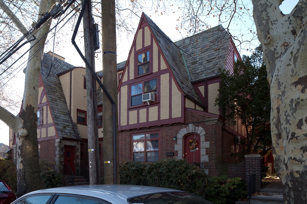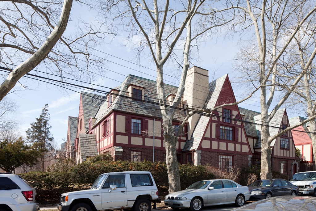 Designed by respected architect Benjamin Braunstein, the Tudor-style homes were built in 1930 and 1931. The architect arranged the homes into two groups with varying sizes, surrounding a courtyard.