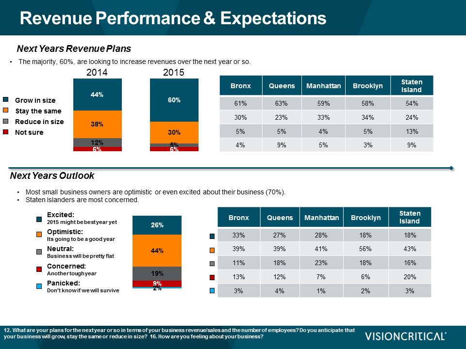 “Businesses in Queens and across the city are optimistic because not only did 75 percent of businesses in Queens (and 77 percent citywide) meet or exceed their revenue goals in 2014, but 63 percent of businesses in Queens anticipate being able to increase their revenues during 2015,” said Chris Giamo, TD Bank Regional President, Metro New York. “This trend toward growth naturally leads to a better outlook on business, but we are seeing that many business owners are still approaching expansion in a careful and well-planned way, meaning they aren’t ready to take major risks.”