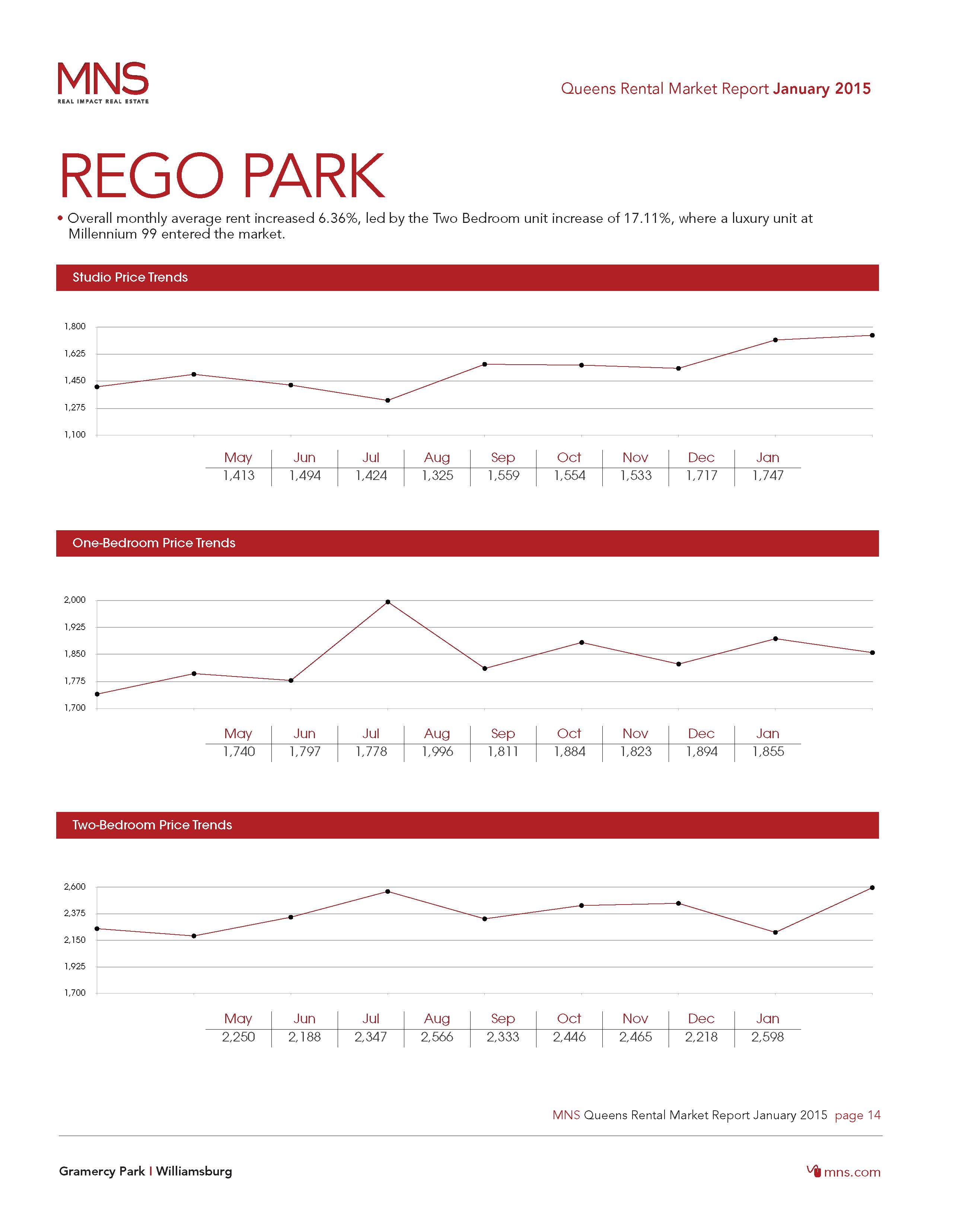 Rego Park is continuing its hot streak. Average prices in the neighborhood are continuing to burn through residents’ wallets as new luxury units recently entered the market. For the month of January, average prices for two-bedrooms in the neighborhood rose a whopping 17.1 percent during the month to $2,598. From November to December 2014, Rego Park rental studios saw an stark increase of 12 percent in average rents.