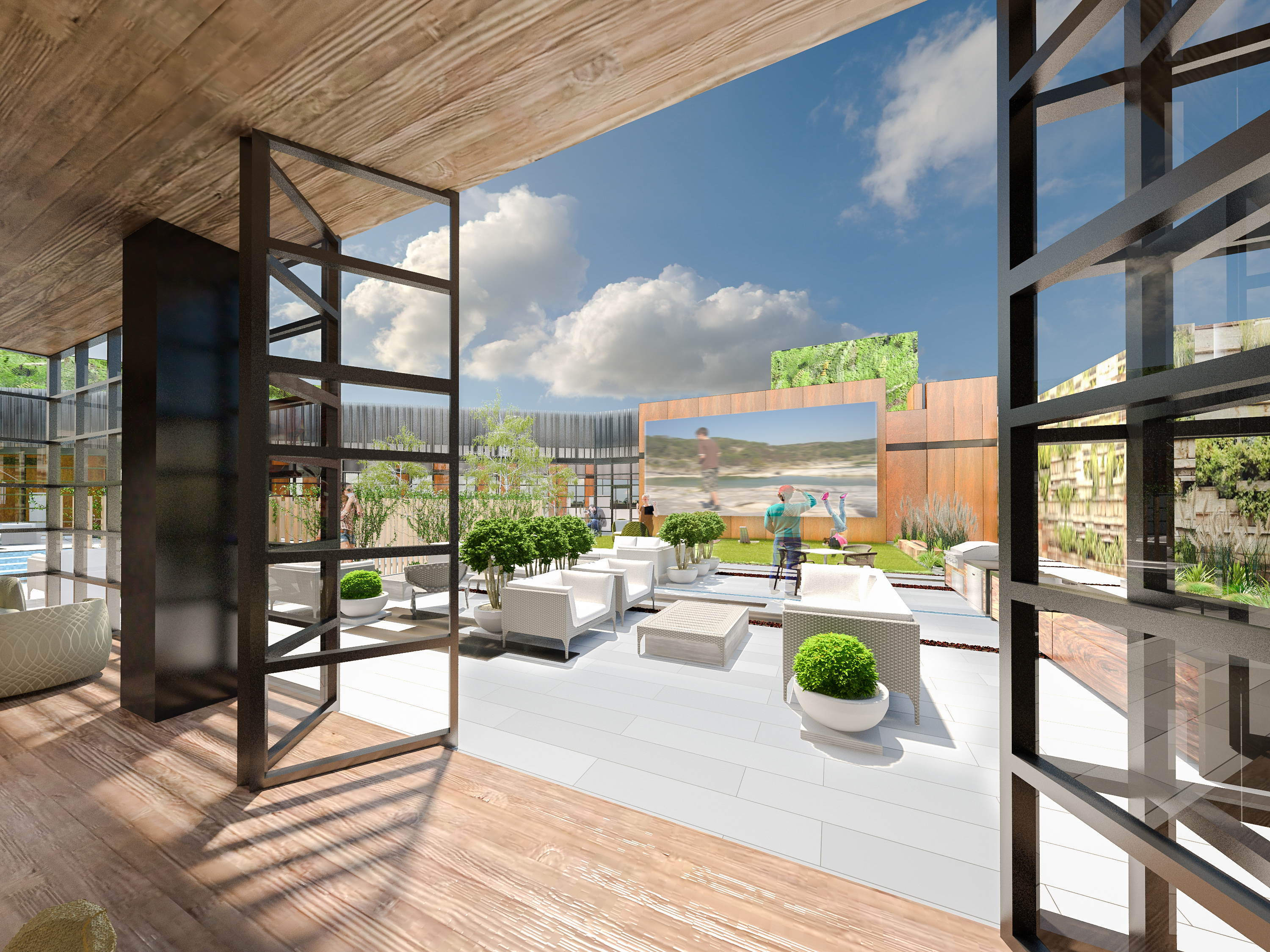 Between the amenities building and the 35-story tower will be a courtyard with seating, a pool with a 50-foot lap lane, a grilling and bar area, and a large weather-resistant movie screen.