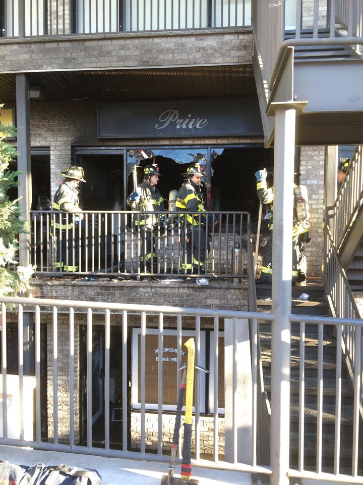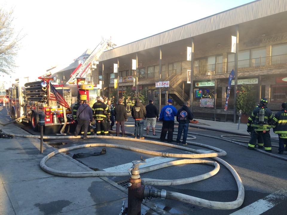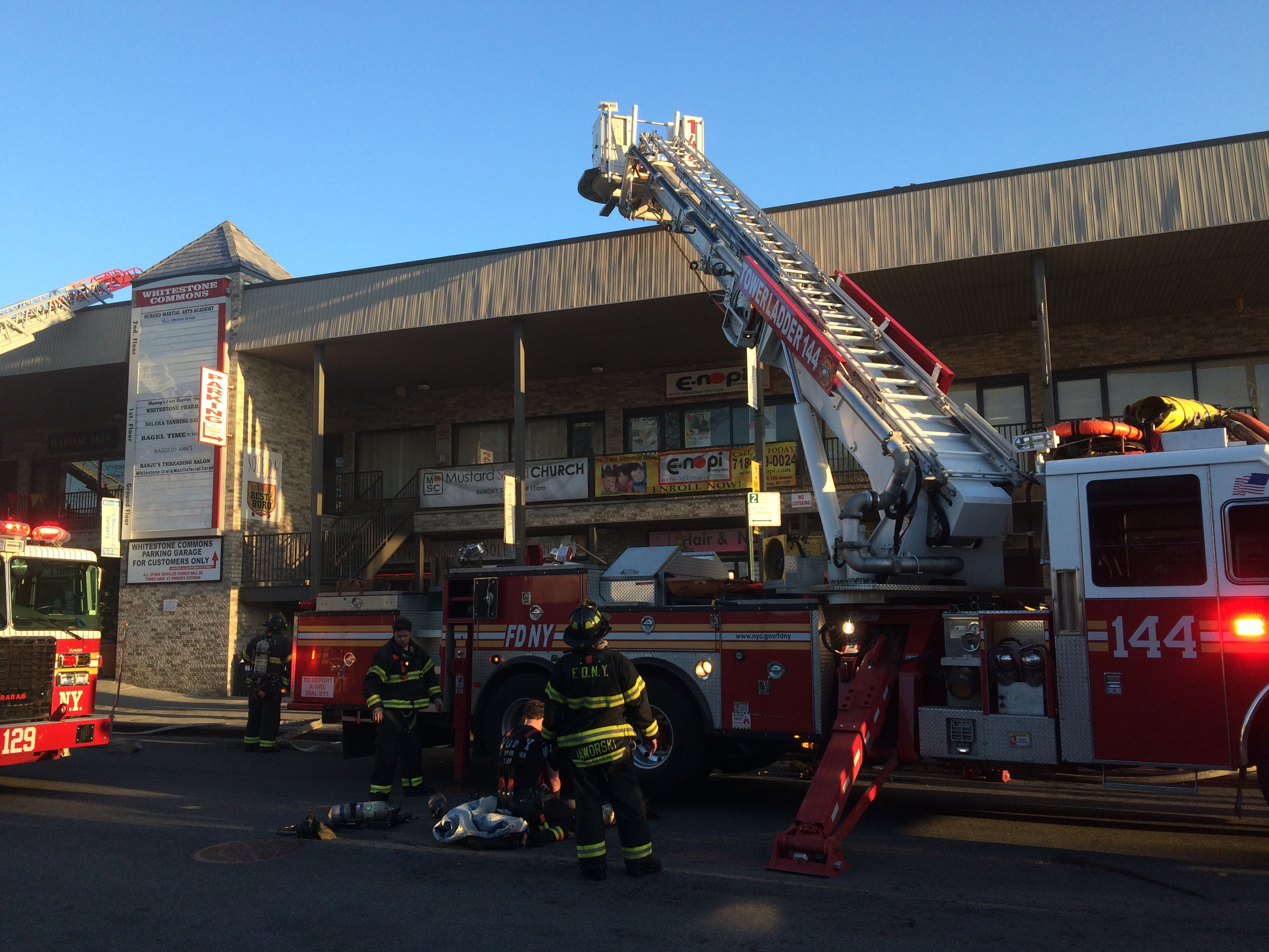 At least two businesses were affected by the fire, Bagel Time and a clothing store called Prive, according to Devon O’Connor of the Welcome To Whitestone Civic Association, and photos from the scene. He said they appeared to be badly damaged.