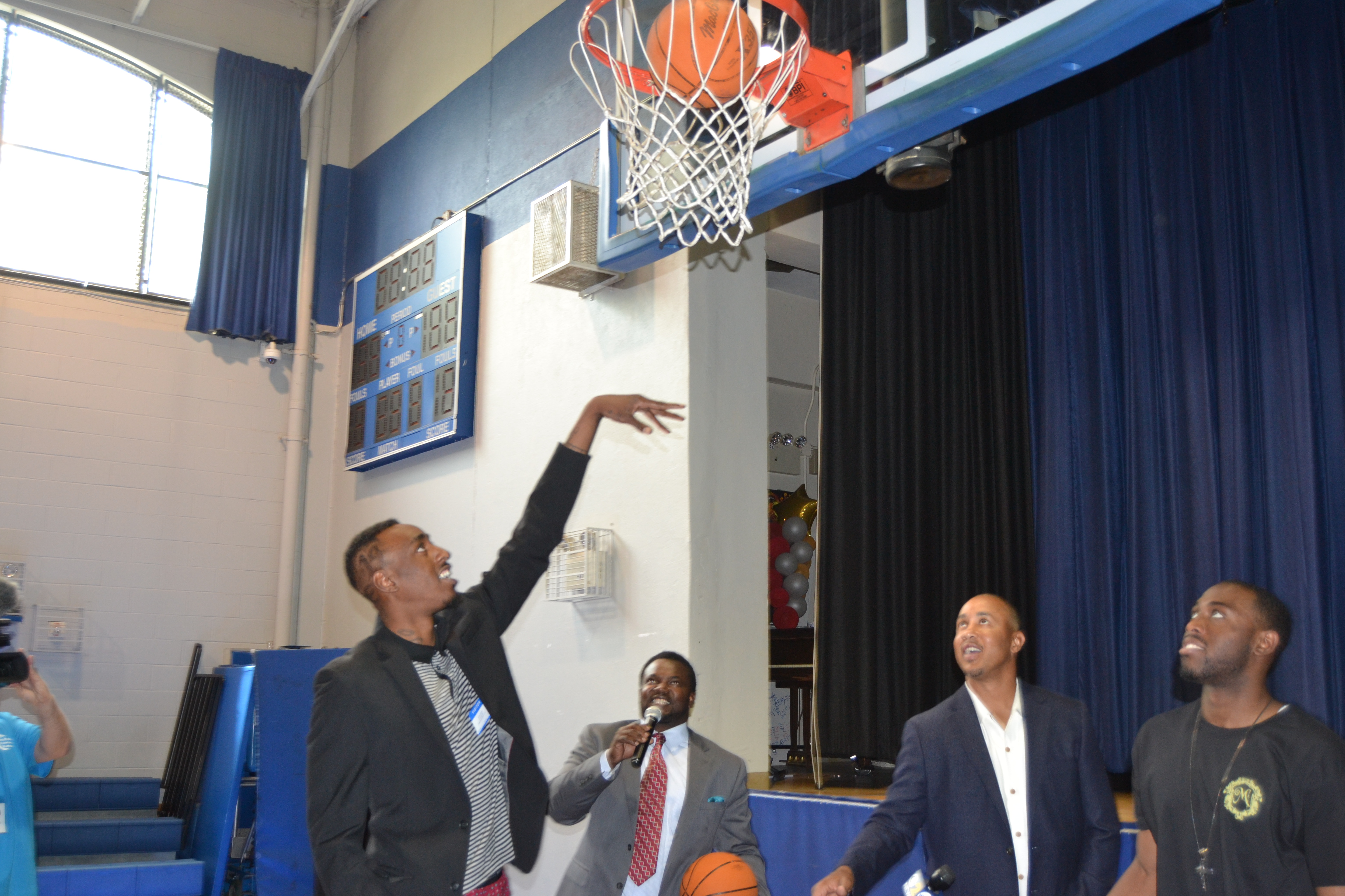 After the ceremony, both of Anthony Mason’s sons, Anthony Jr. and Antoine, took the ceremonial first shots on the court, followed by some shooting by Starks and the children who were in the gymnasium.