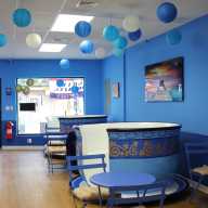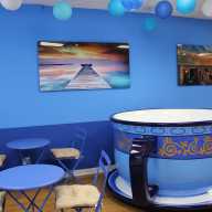 The tea cups were designed by Valentin, made in Asia and transported halfway around the globe to Glendale, with an interesting pit stop in customs along the way. Each teacup is painted in bright shades of blue according to the theme of the café and adorned with a gold filigree stencil design reminiscent to delicate, fine china.