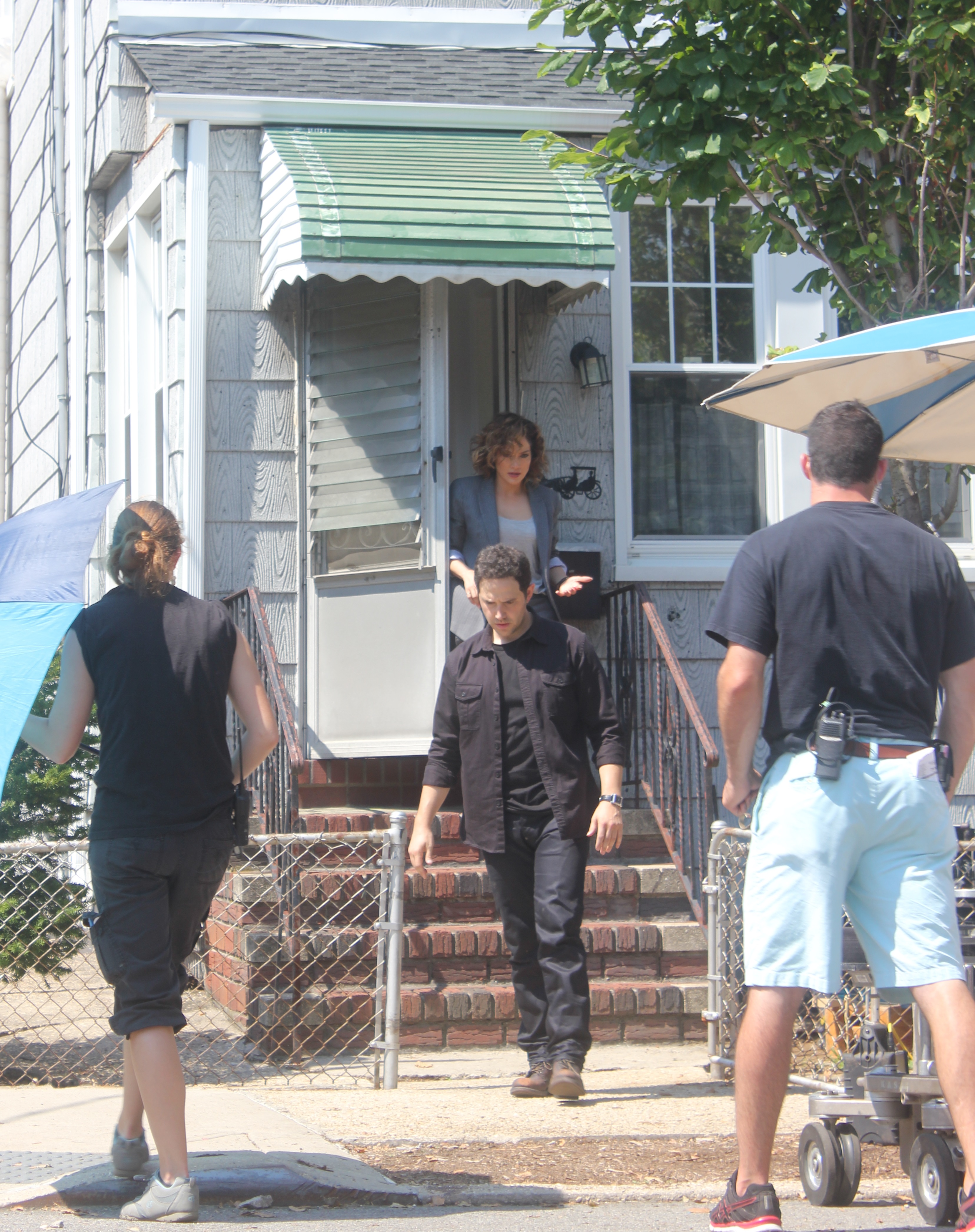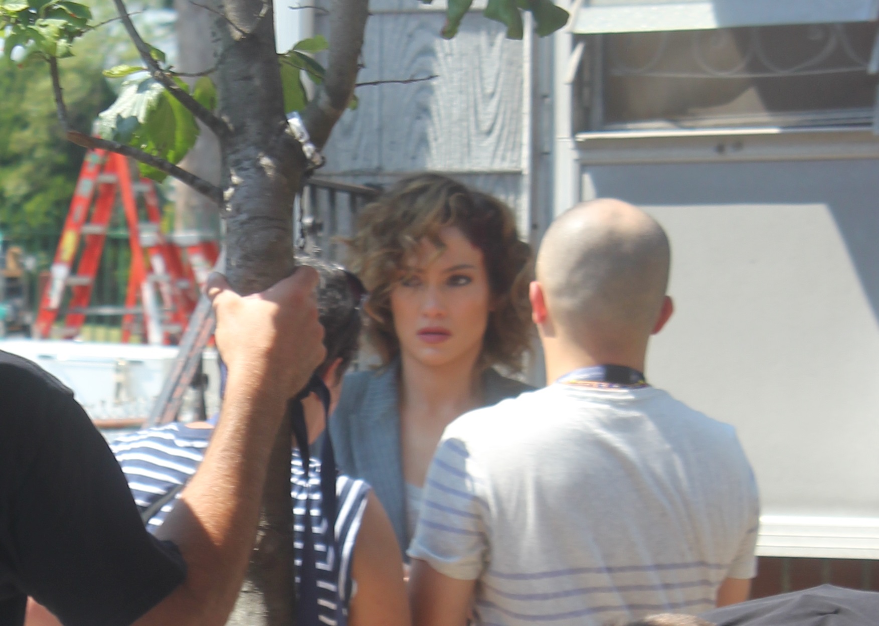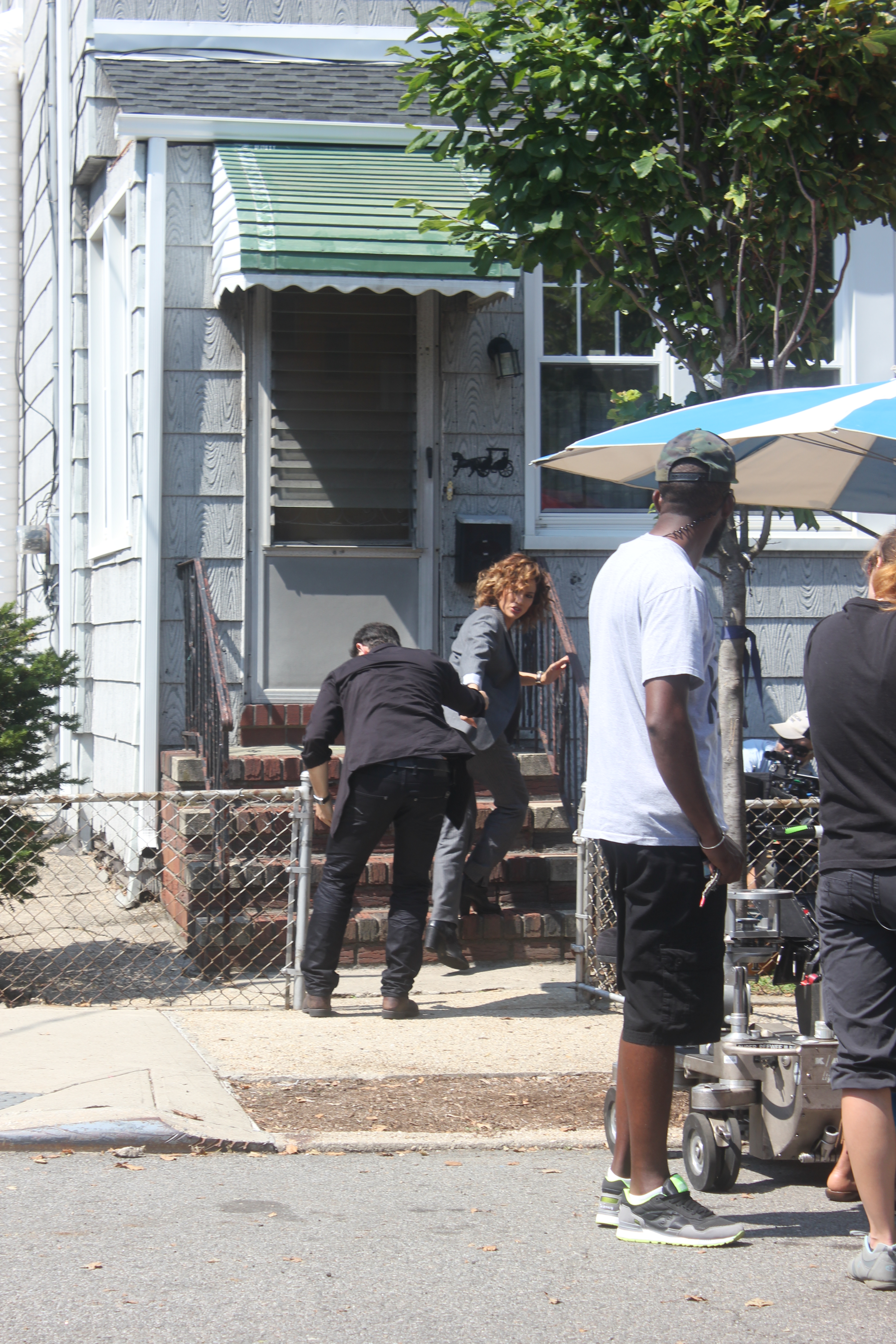 The shoot included a scene in which Lopez’s on-screen partner comes to her rescue after she is found lying on the sidewalk outside the home. The pair then walks up the stoop and into the house. Crew members were busy setting up the scene and touching up Lopez’s makeup in between takes.