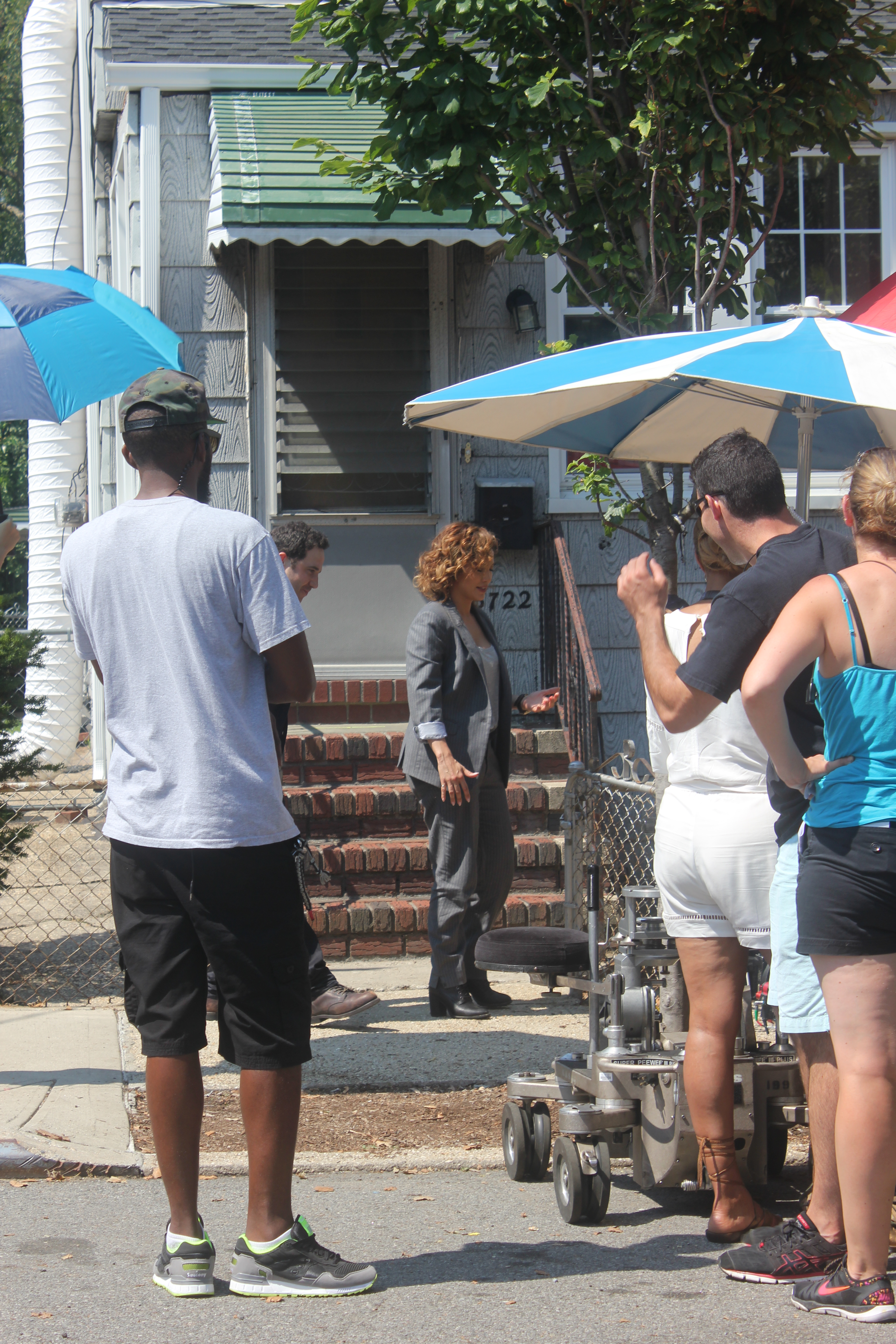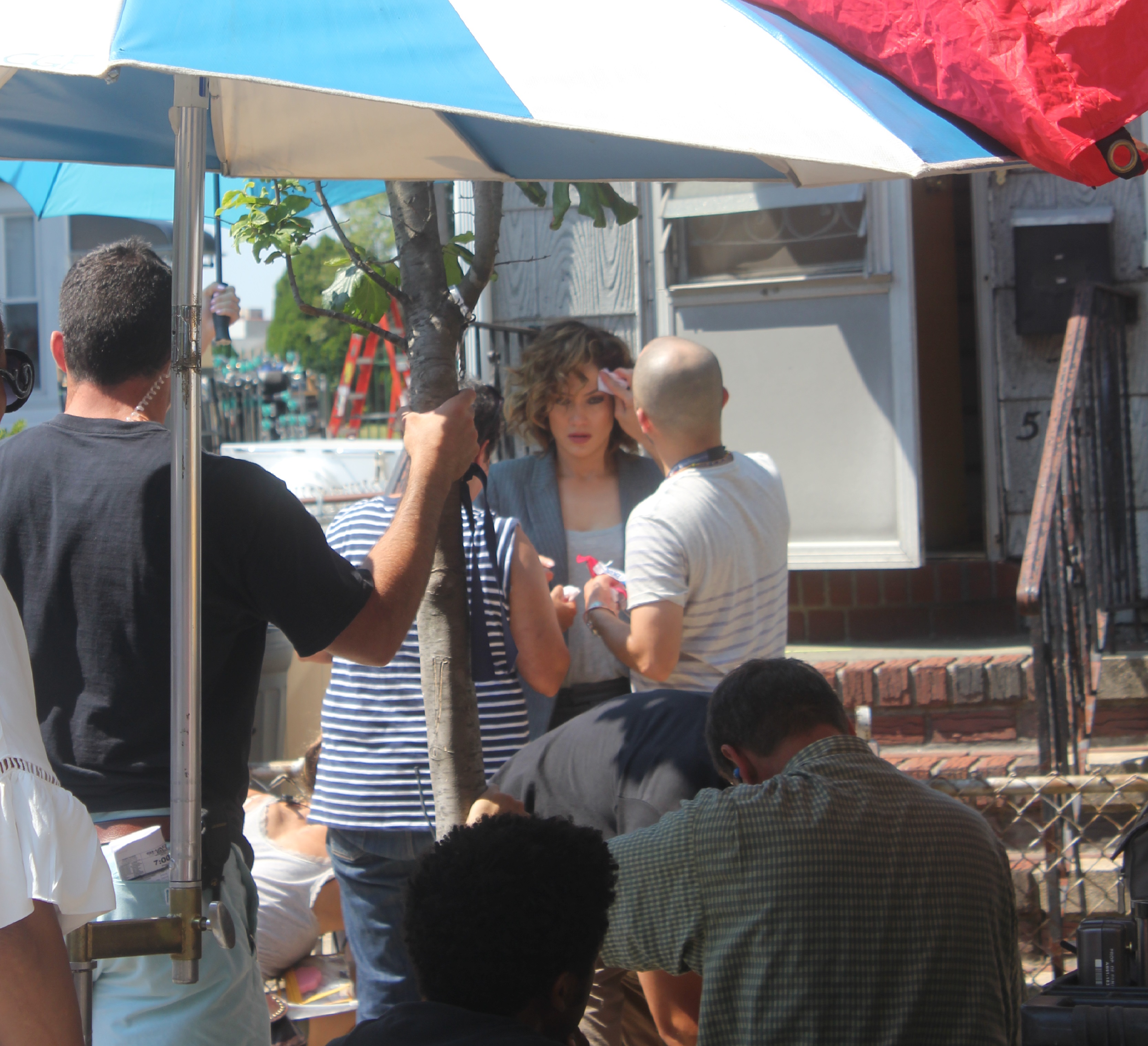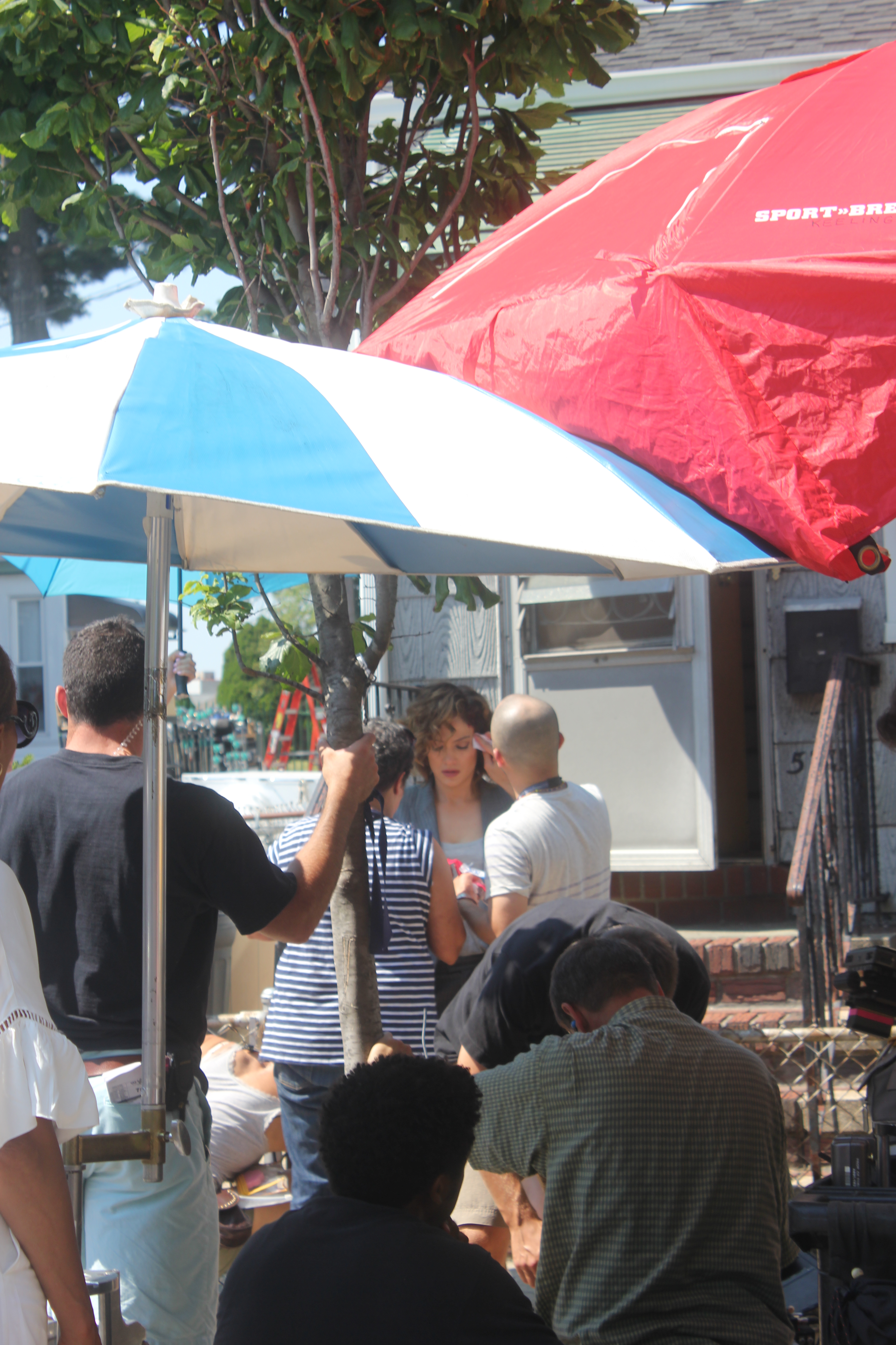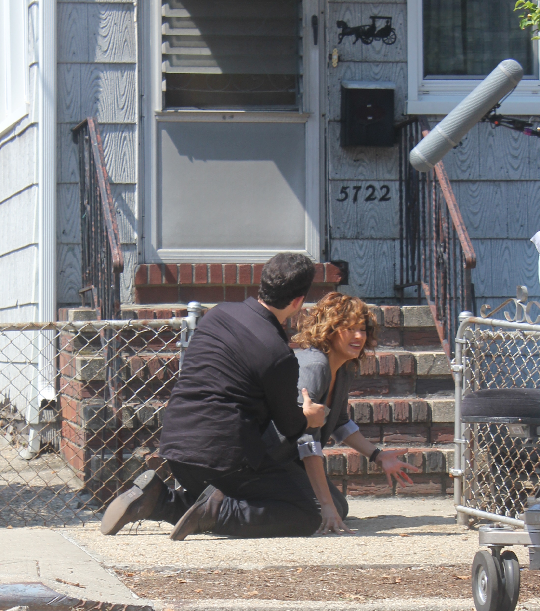 The shoot included a scene in which Lopez’s on-screen partner comes to her rescue after she is found lying on the sidewalk outside the home. The pair then walks up the stoop and into the house. Crew members were busy setting up the scene and touching up Lopez’s makeup in between takes.