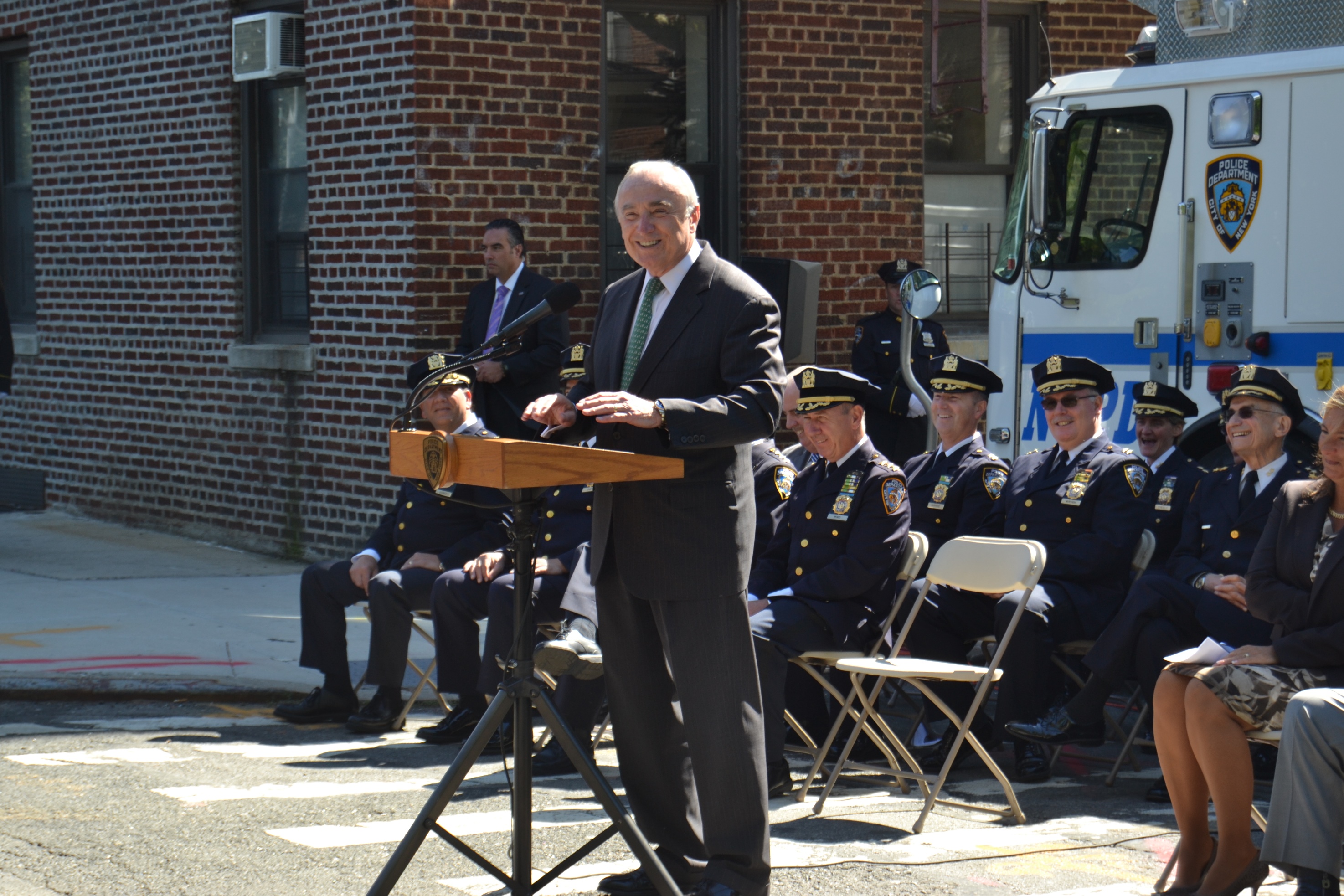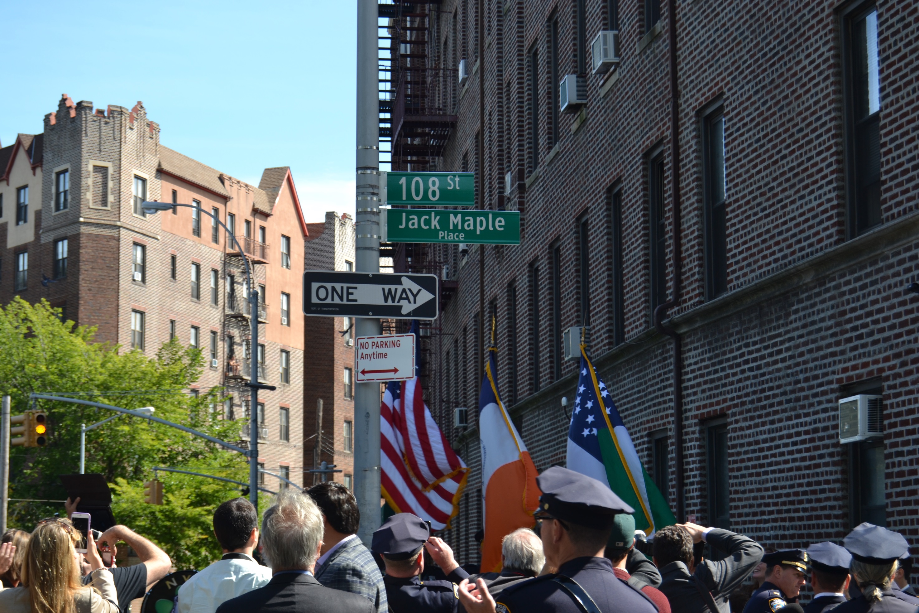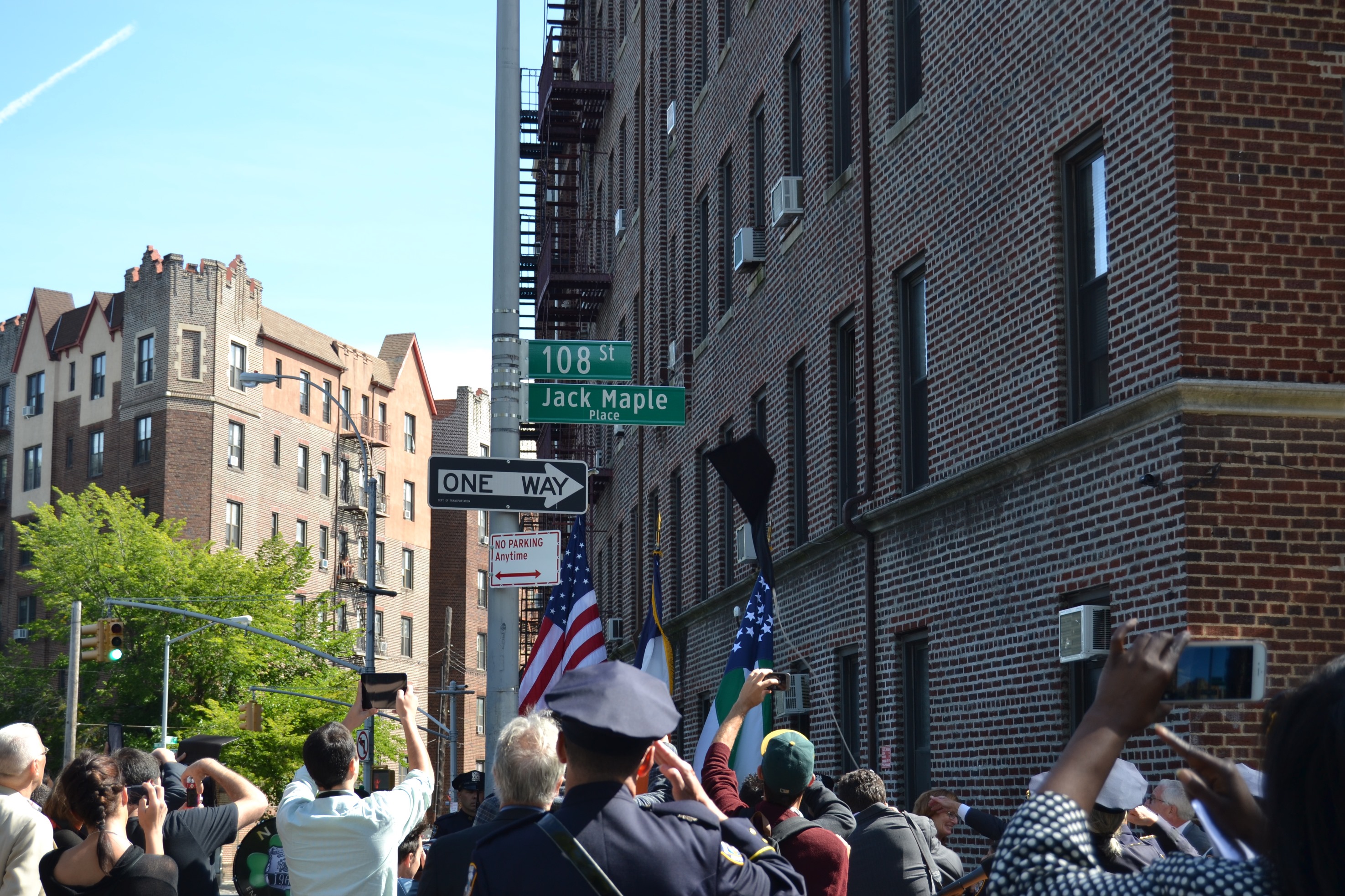 NYPD Commissioner Bill Bratton, Councilman Eric Ulrich, Assemblyman Mike Miller, the NYPD Ceremonial Unit, Community Board 9, the Richmond Hill Historical Society and members of the community were on hand at the corner of 108th Street and Park Lane South for the unveiling of Jack Maple Place.