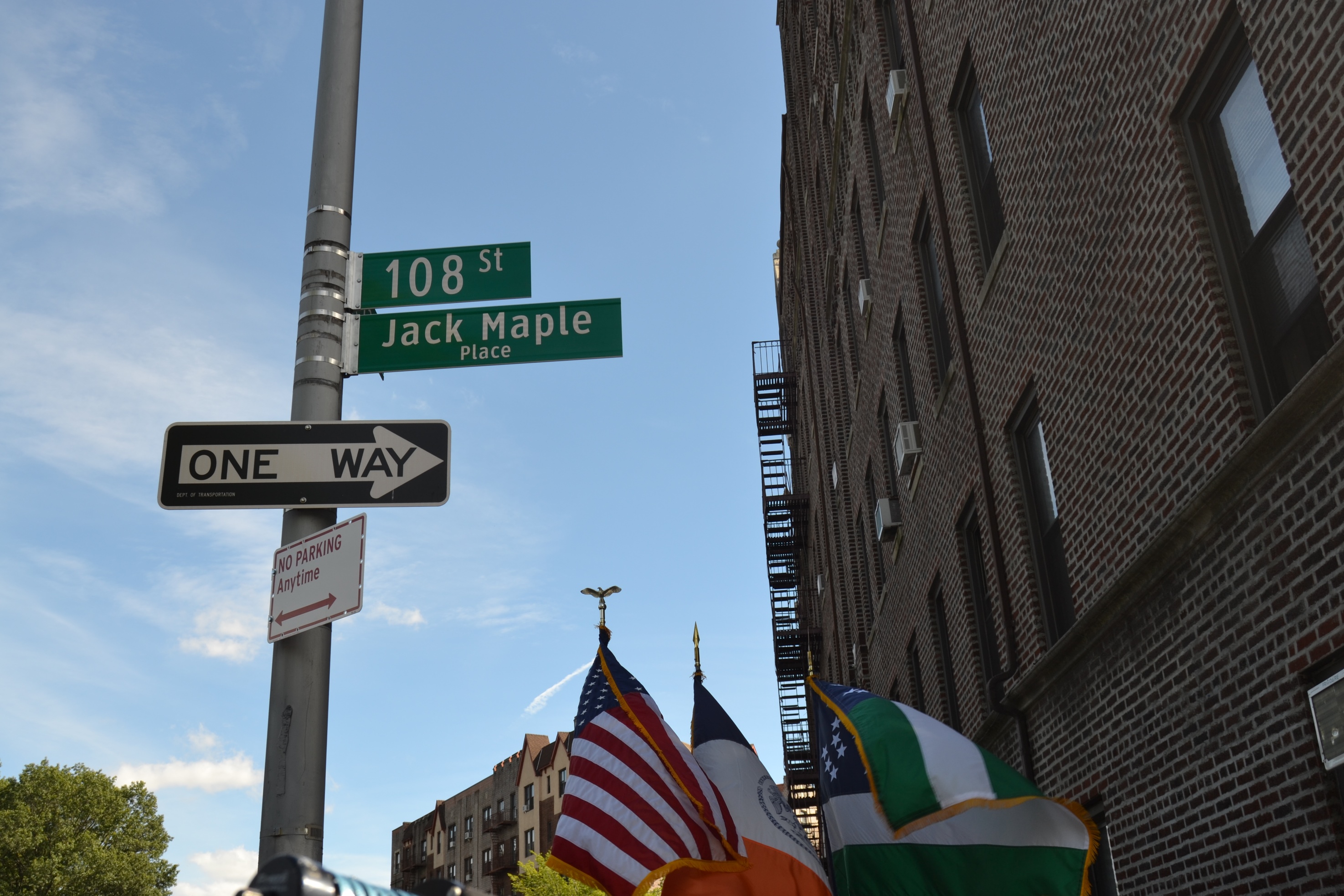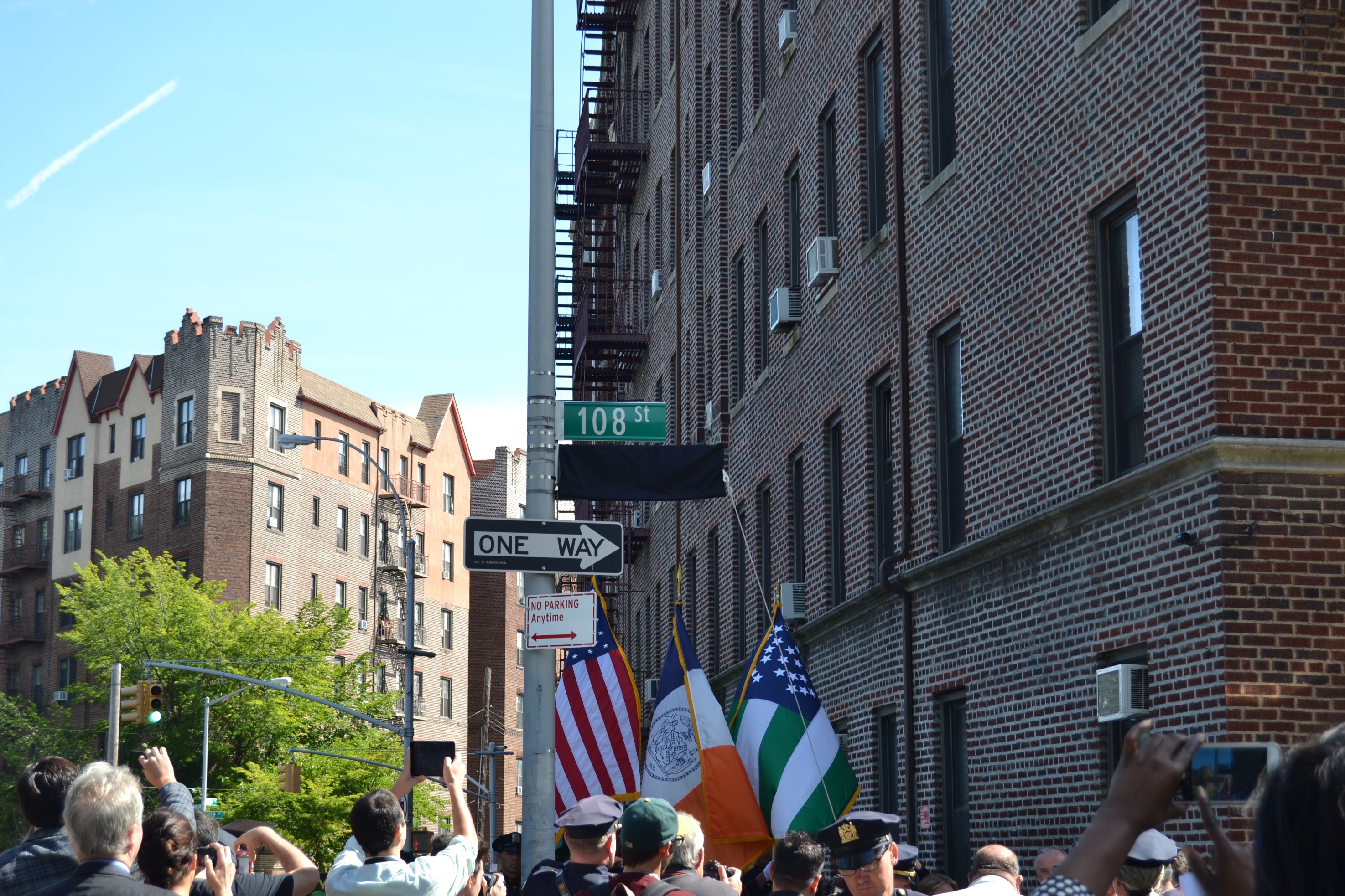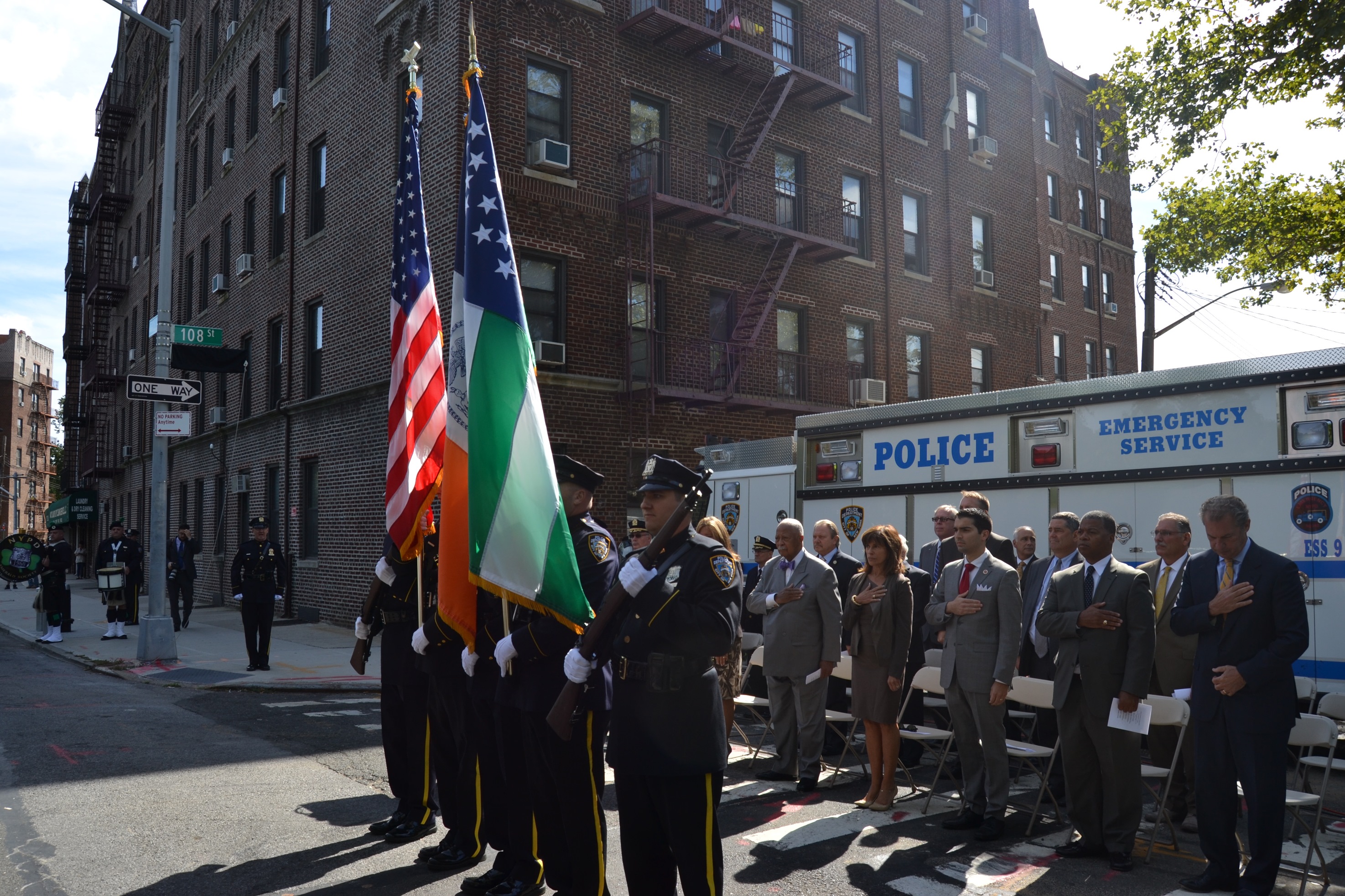 NYPD Commissioner Bill Bratton, Councilman Eric Ulrich, Assemblyman Mike Miller, the NYPD Ceremonial Unit, Community Board 9, the Richmond Hill Historical Society and members of the community were on hand at the corner of 108th Street and Park Lane South for the unveiling of Jack Maple Place.