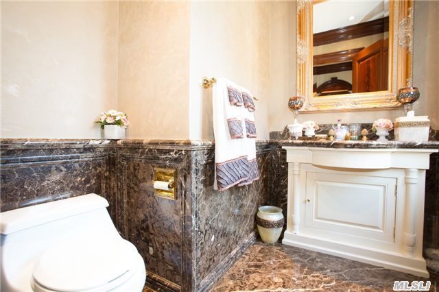 The house includes a powder room with marble panels, a family room with a custom built-in cabinet with glass doors and recessed pilasters, and a formal dinning room, also equipped with custom cabinetry.