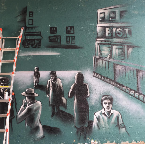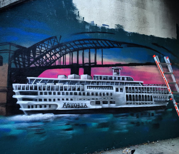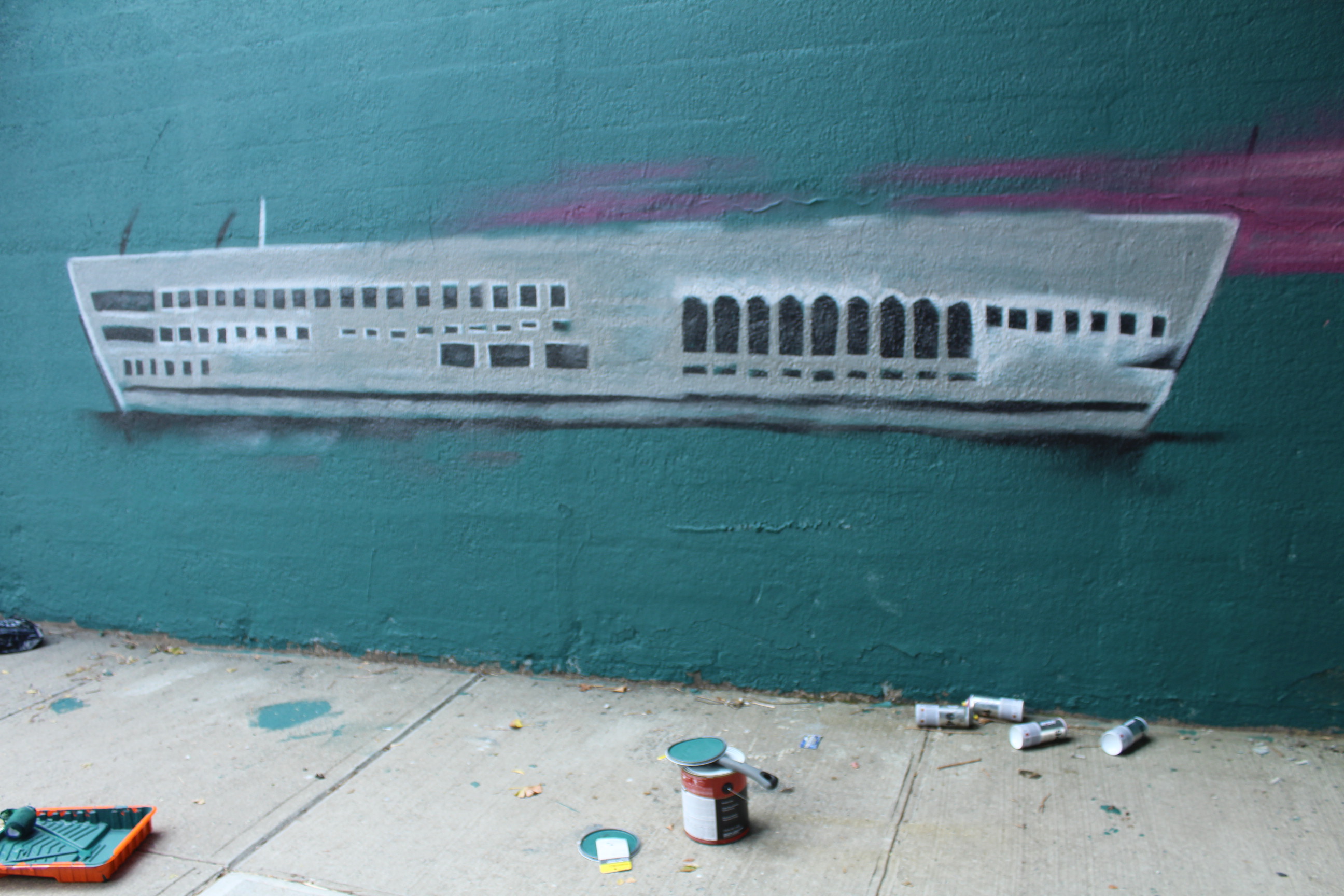 501 (See)(Streets), an organization that beautifies walls across New York City, is in the process of transforming an old Astoria wall into a bustling scene depicting iconic landmarks like the Hell Gate Bridge, Air Line Diner and residents dressed in old-school garb.