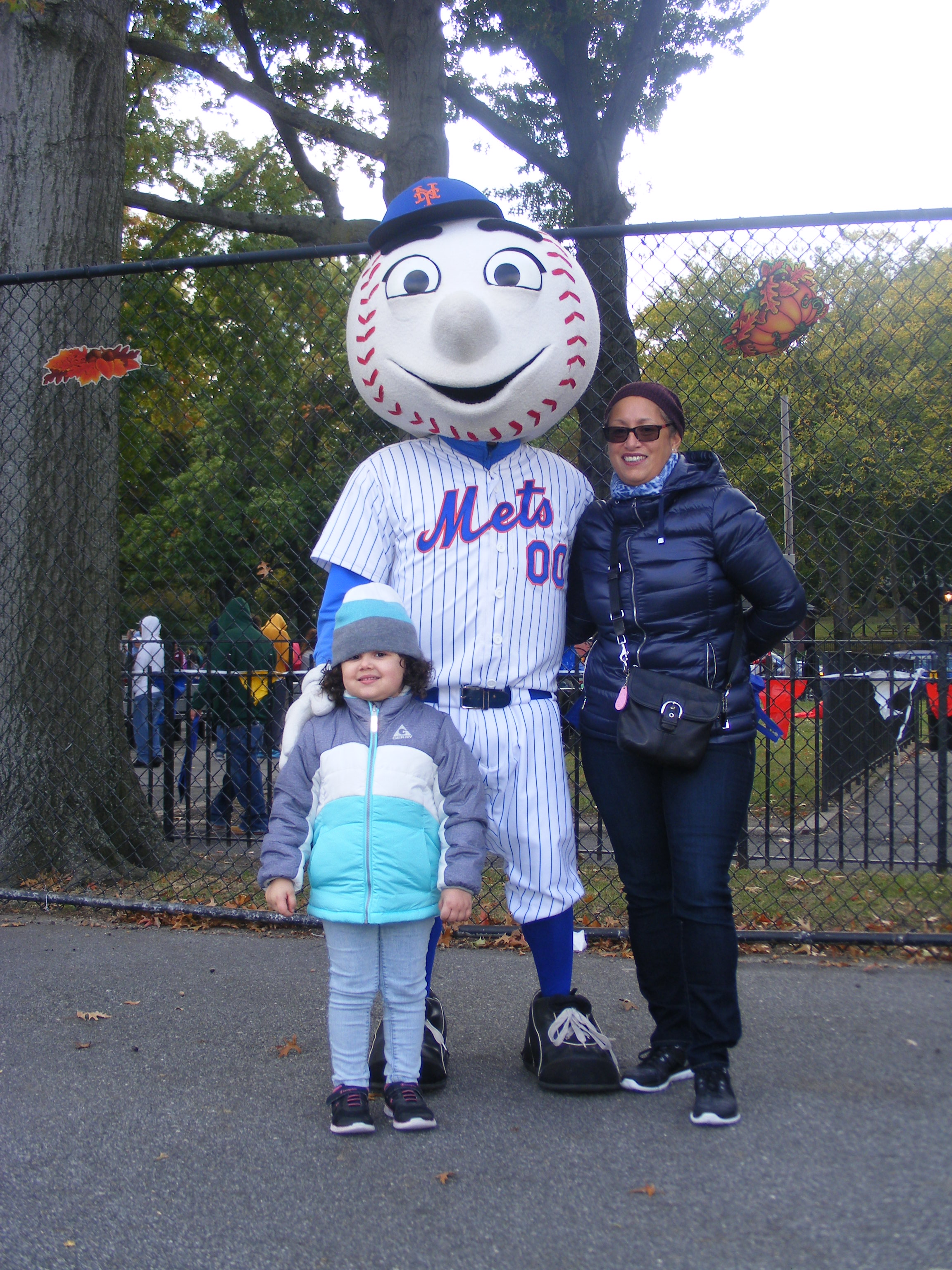 Despite being busy for the playoffs, Mr. Met also took some time out to visit with children and have his photo taken with them.