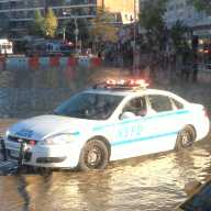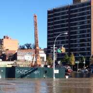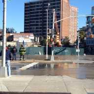 According to the 110th Precinct, which is on the scene, a crane at the construction site at the location struck the water main, causing the flooding.