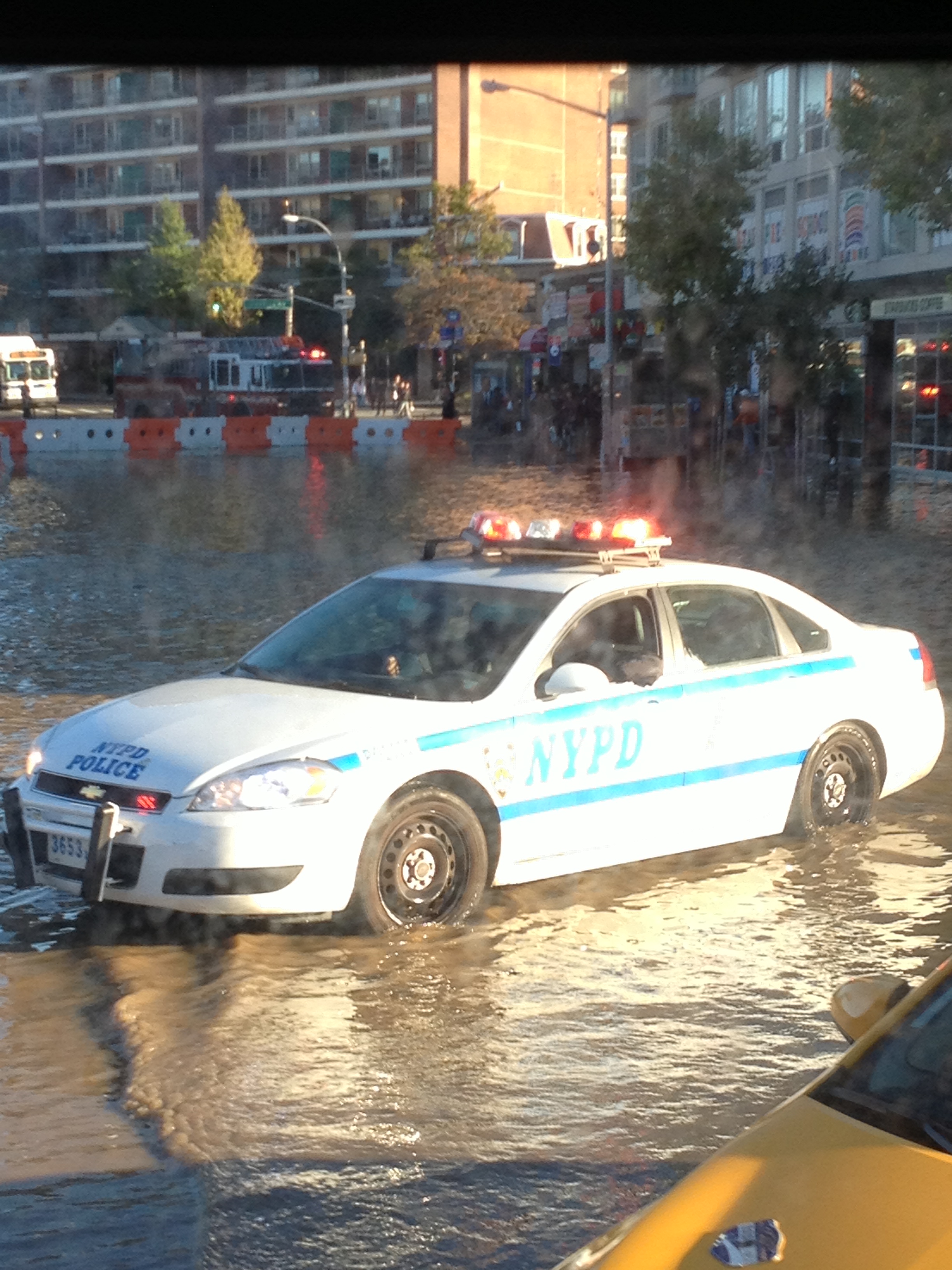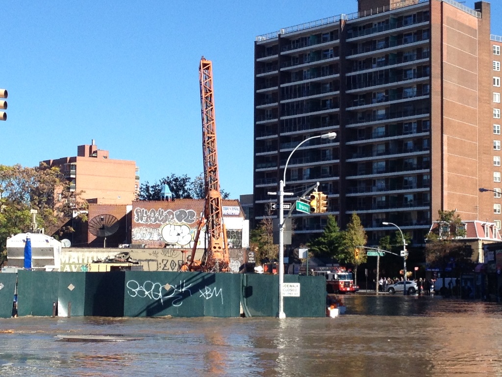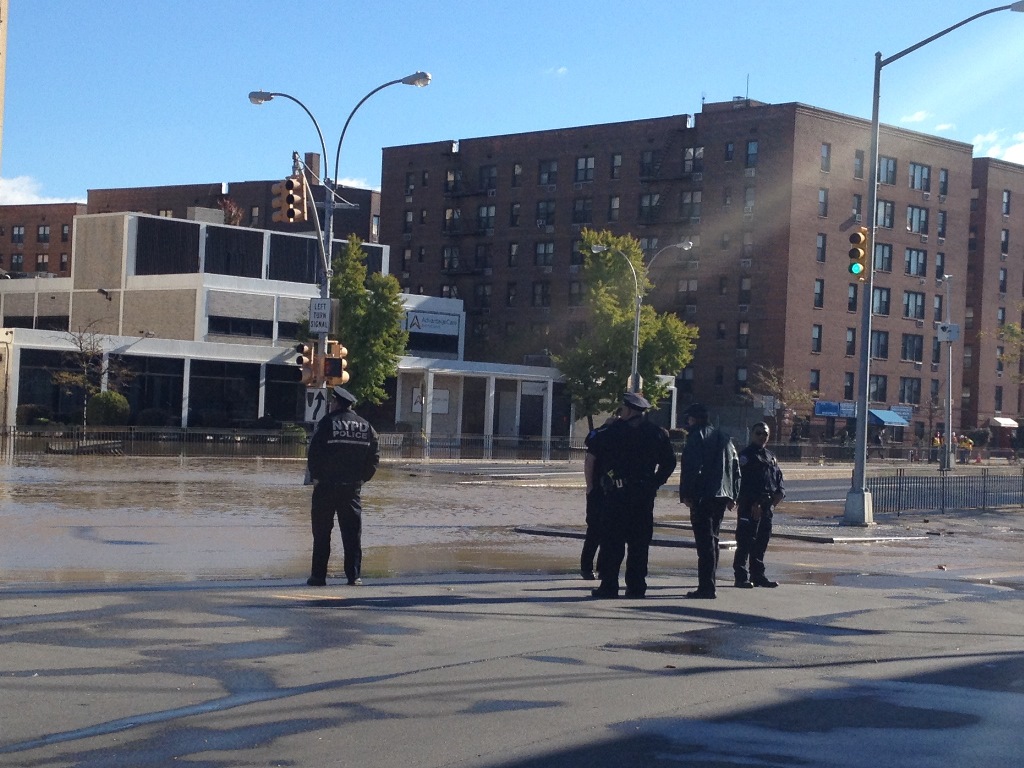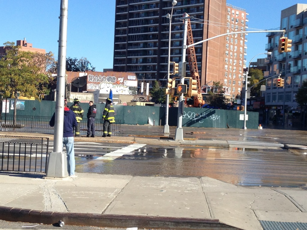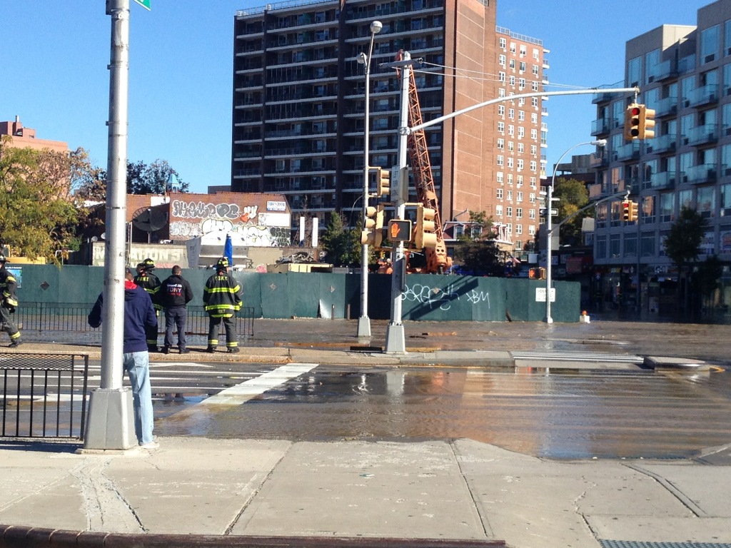 According to the 110th Precinct, which is on the scene, a crane at the construction site at the location struck the water main, causing the flooding.