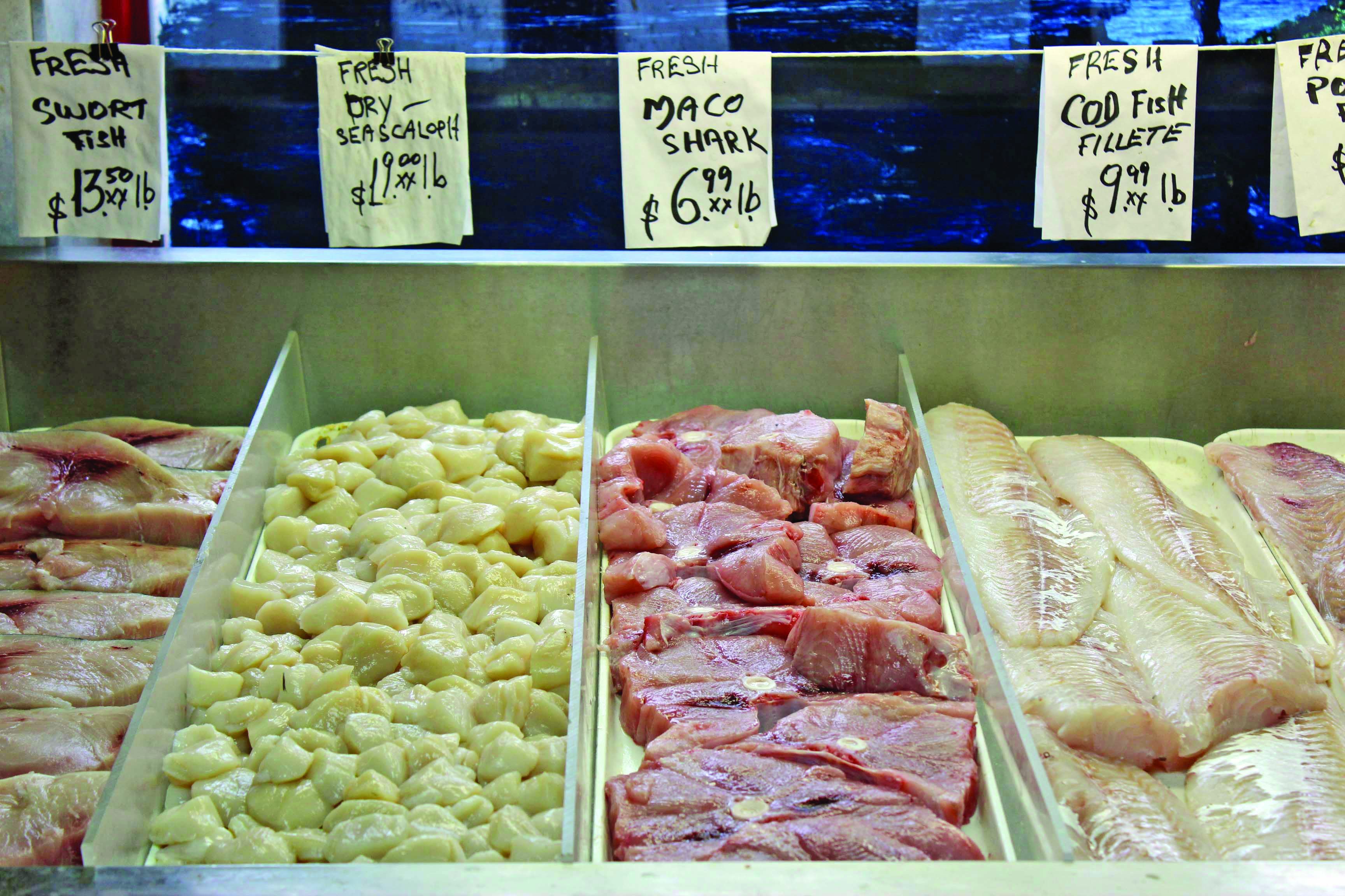 There is a hot station with several tempting options—there were stuffed lobster tails on one occasion—which include one main seafood selection accompanied by two sides for just $10 at lunchtime. Or you can sort through the rows and rows of iced fresh red snapper, swordfish, salmon, scallops, lobster, enormous prawns, mussels, clams and every other type of fish imaginable.