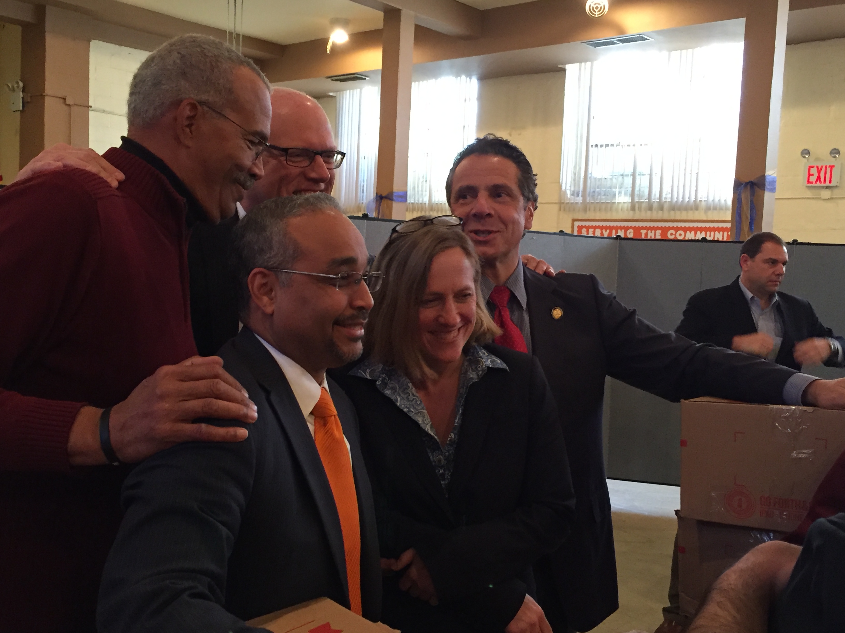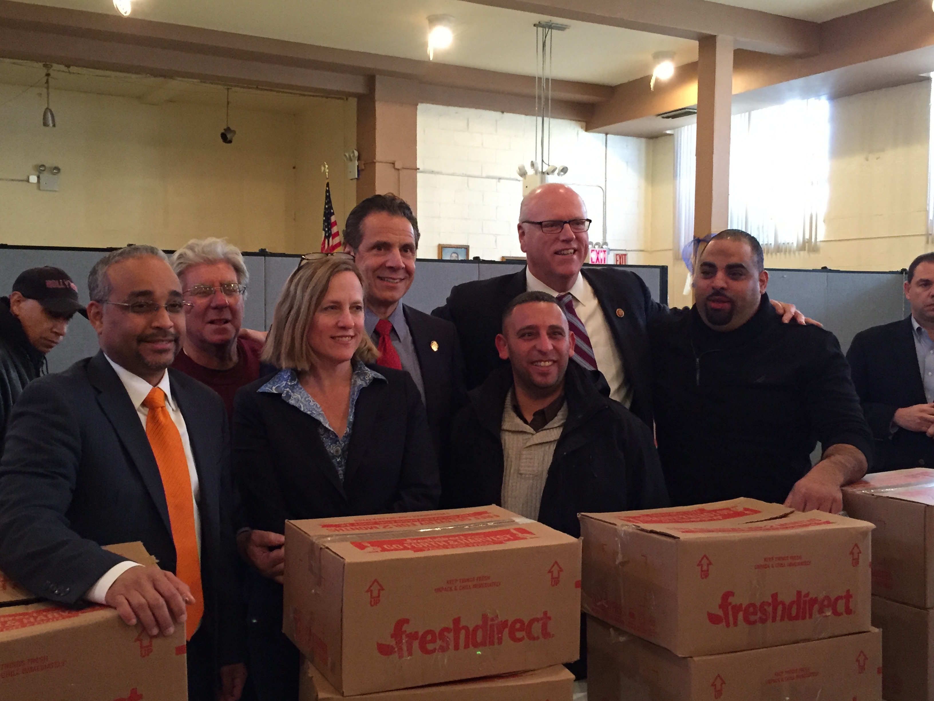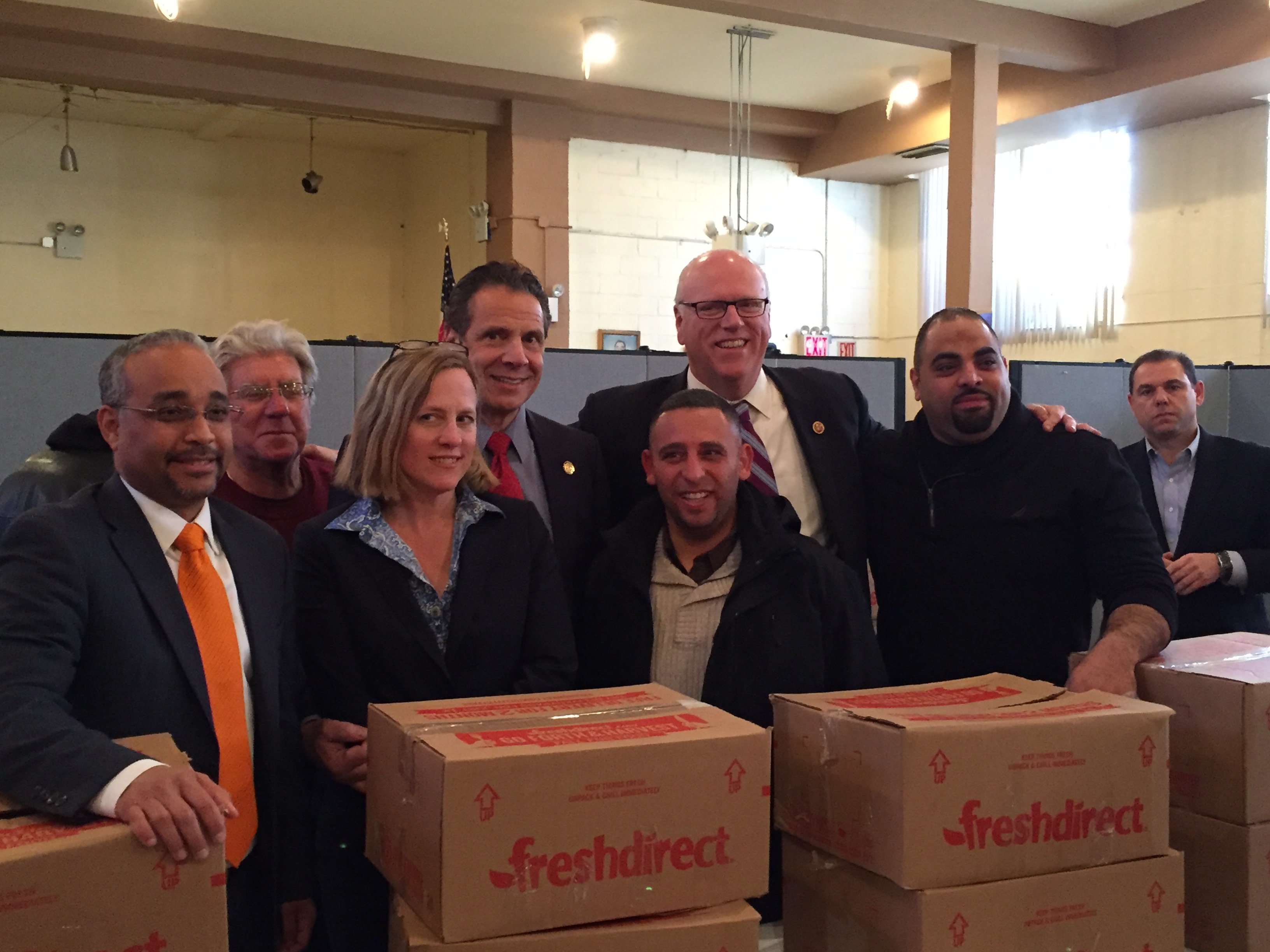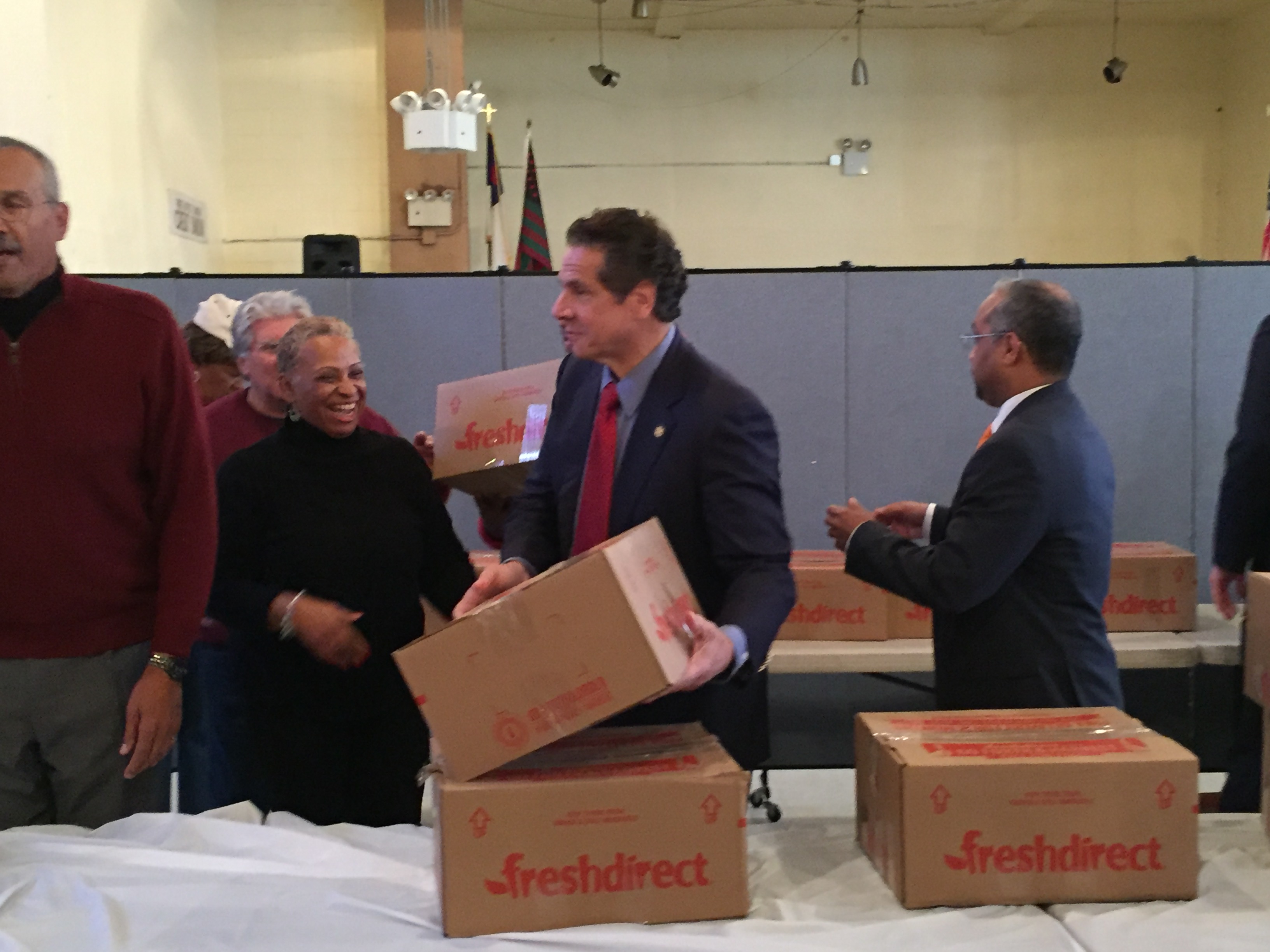 Queens Borough President Melinda Katz, Congressman Joseph Crowley, state Senator Jose Peralta and Assemblyman Jeffrion Aubry joined the governor at the church, where people lined up to receive turkeys from Fresh Direct.