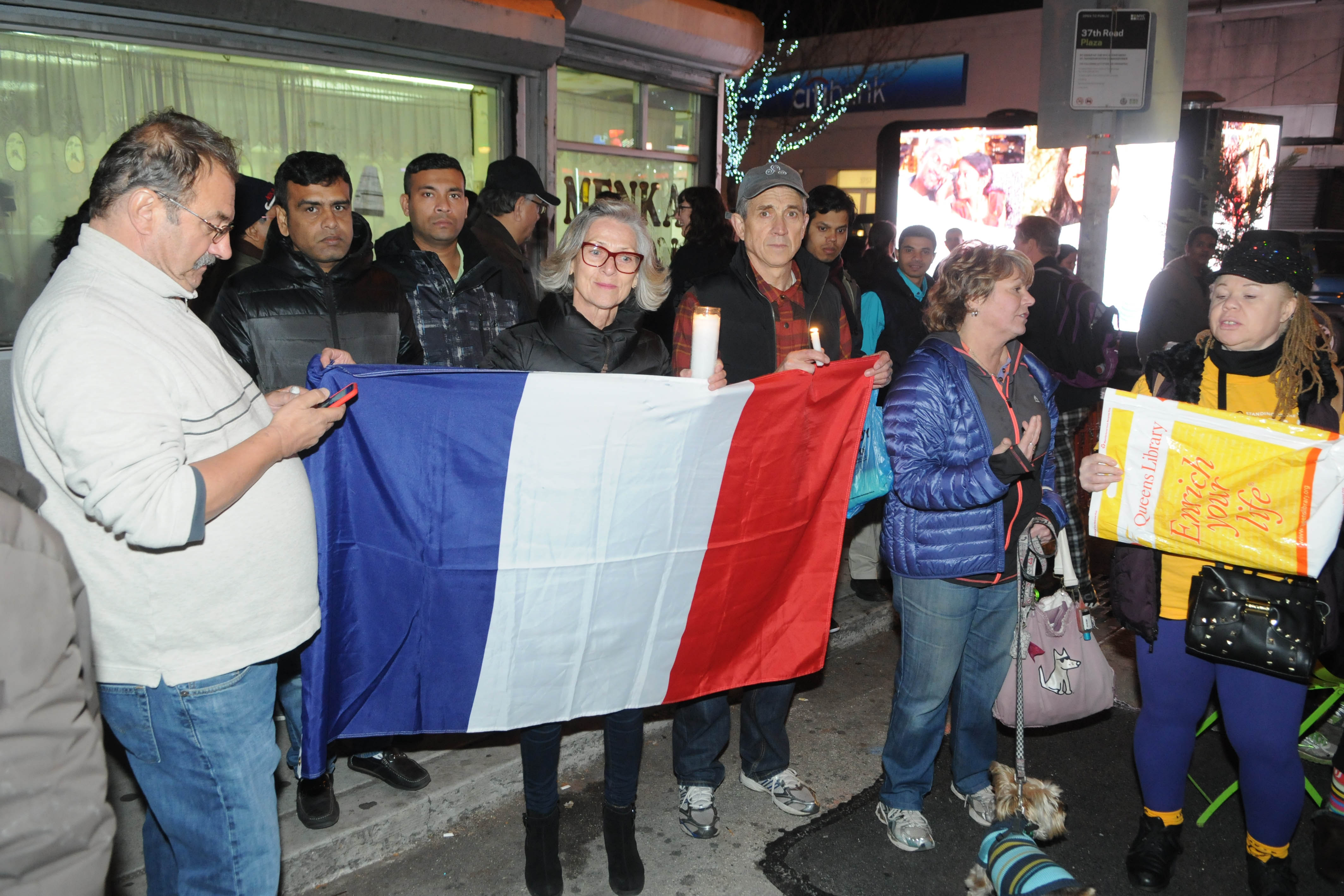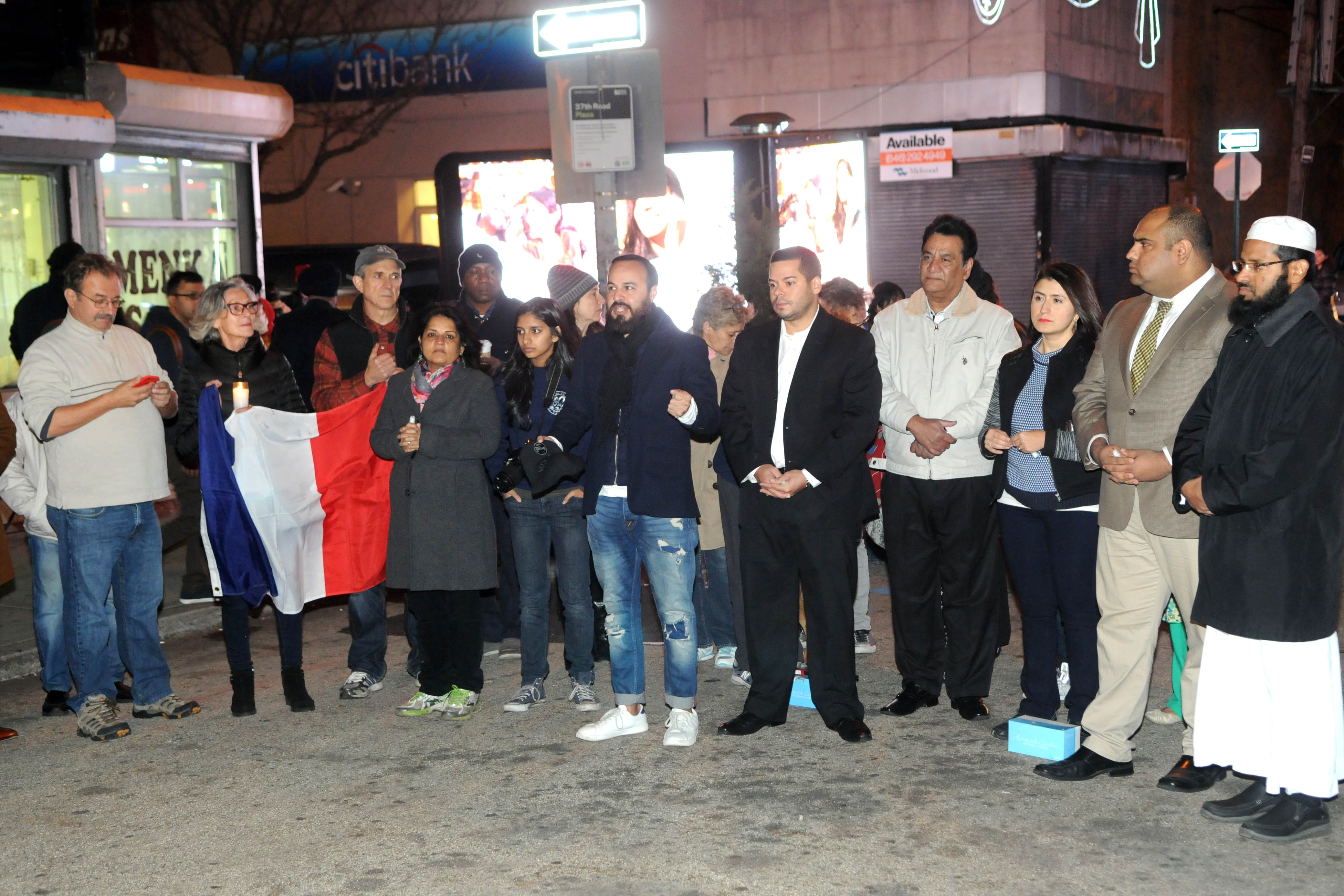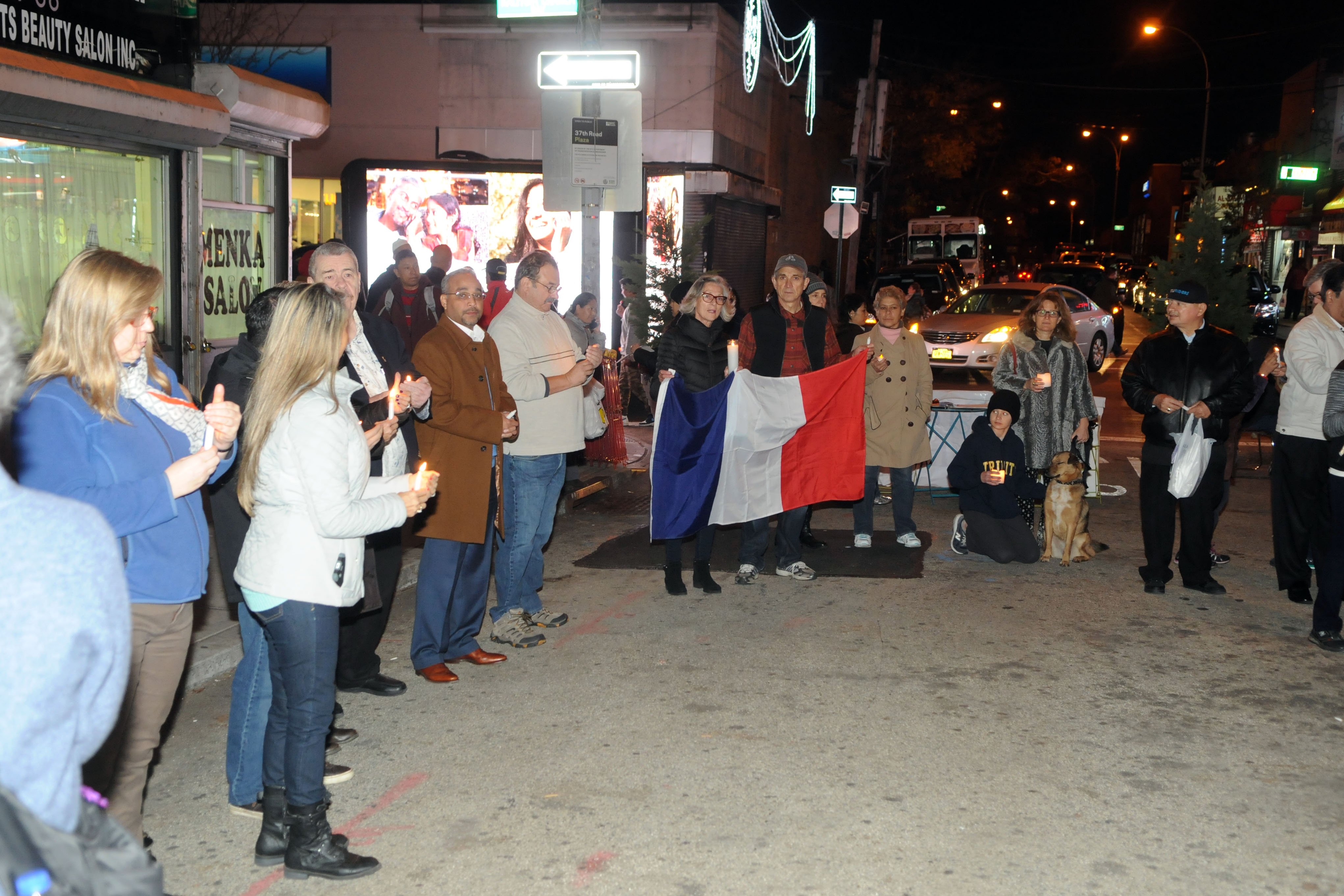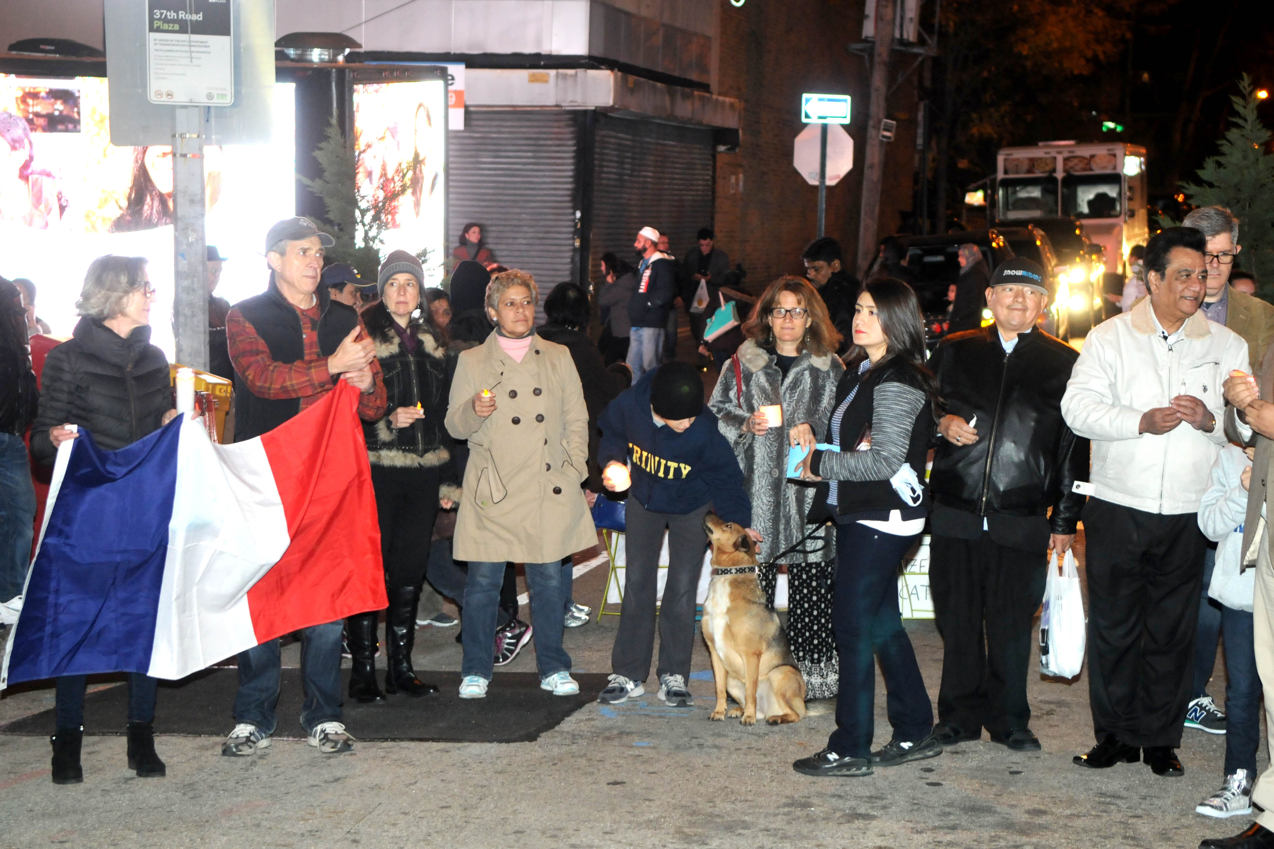 Queens residents gathered at Diversity Plaza in Jackson Heights on Sunday for a candlelight vigil to honor the victims of the terrorist attacks carried out in Paris on Friday.