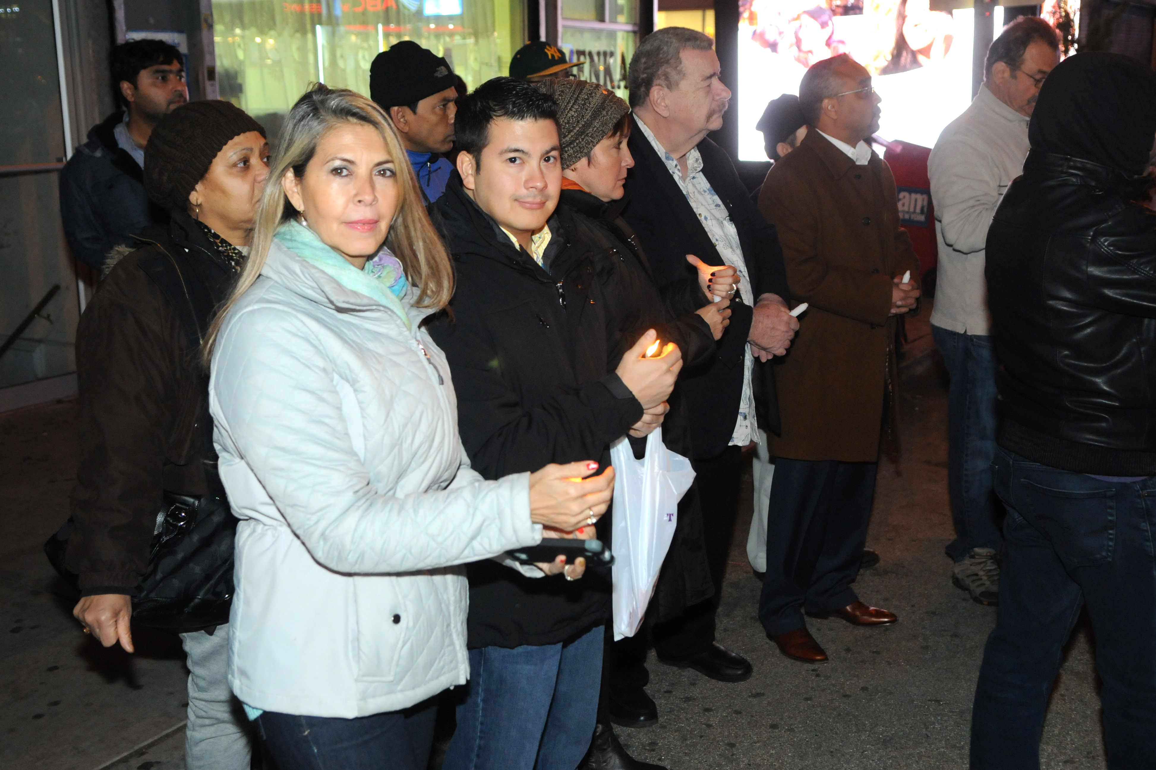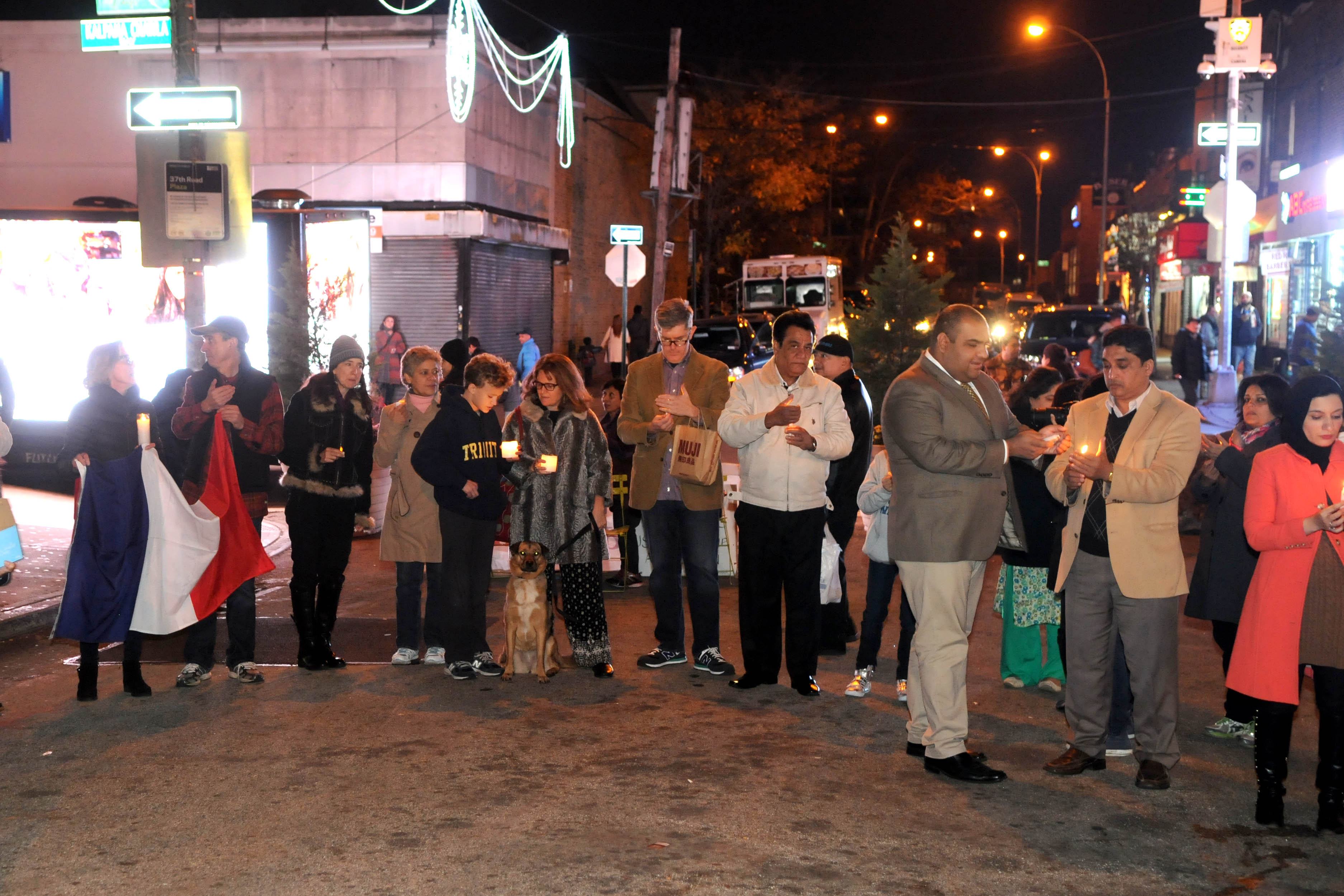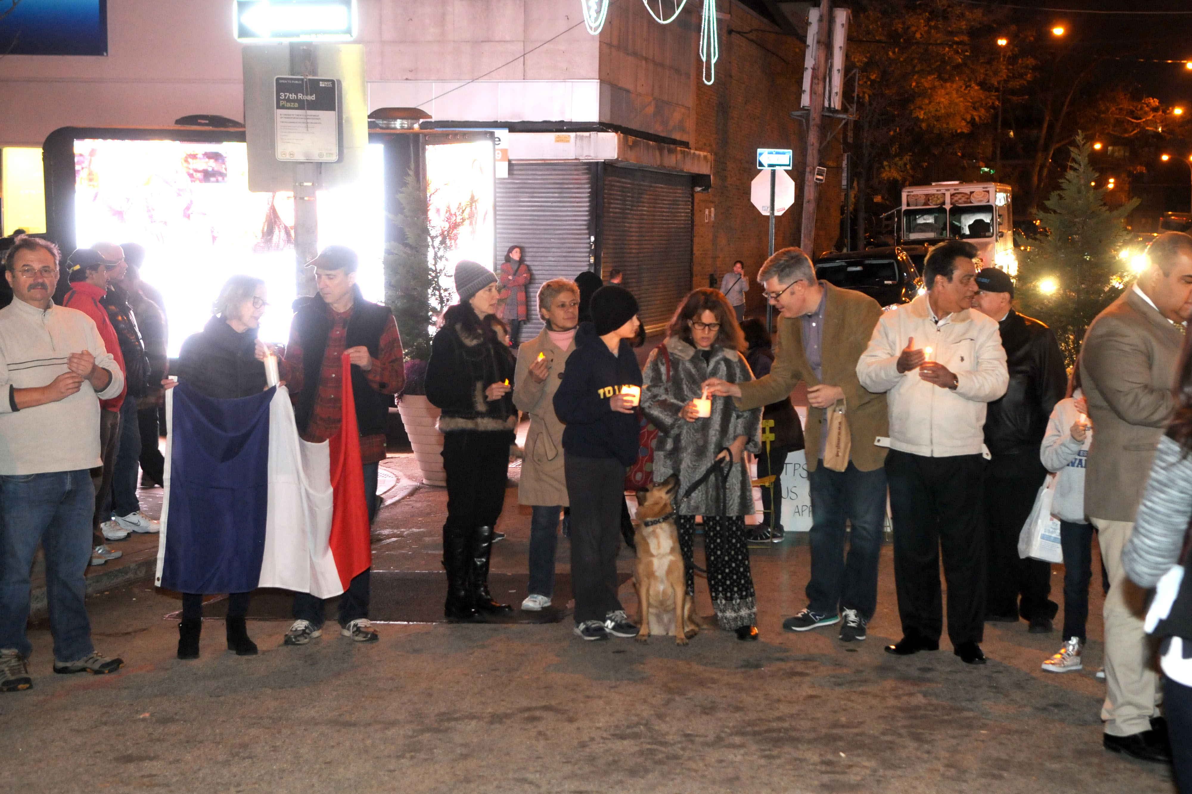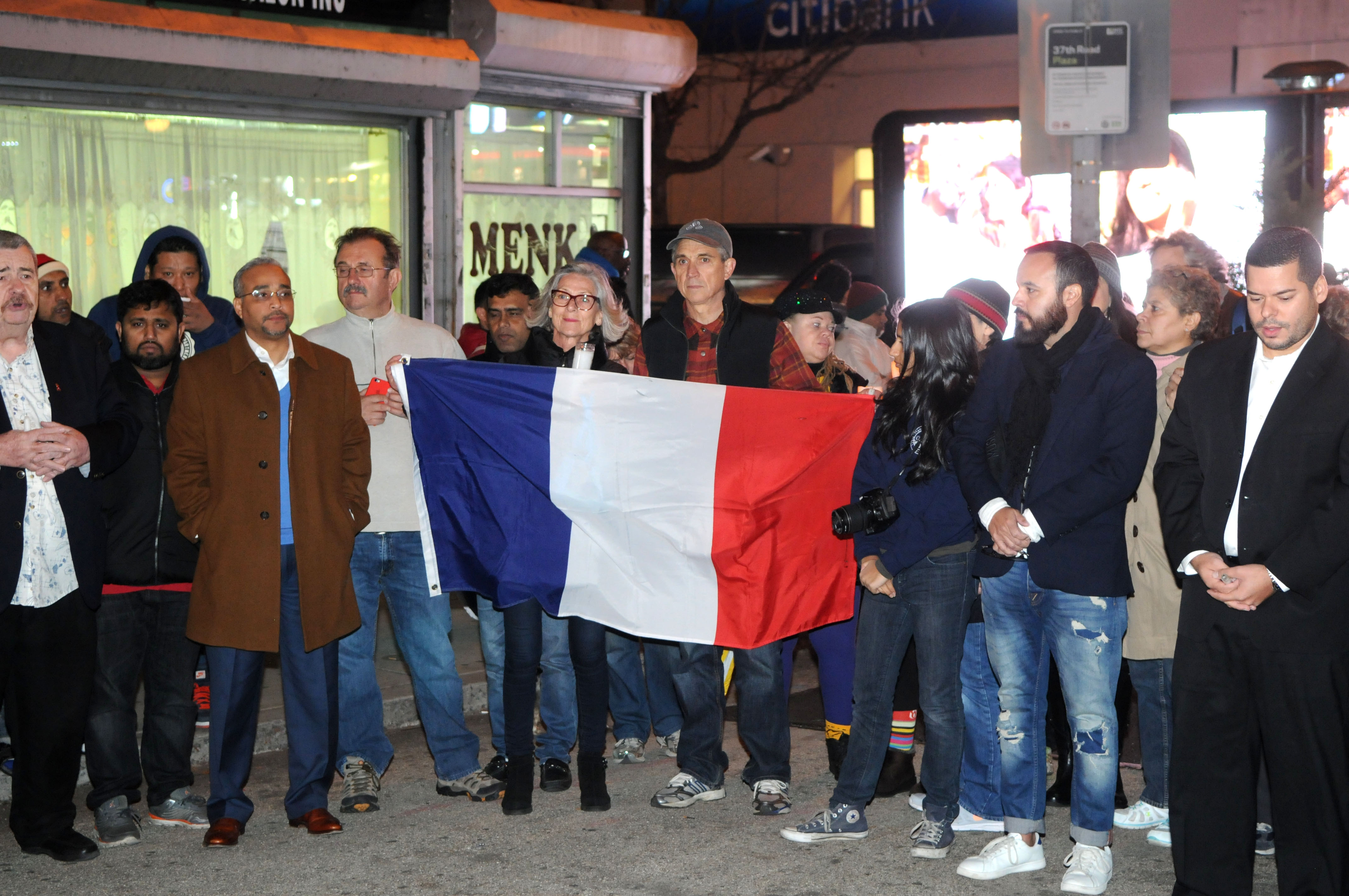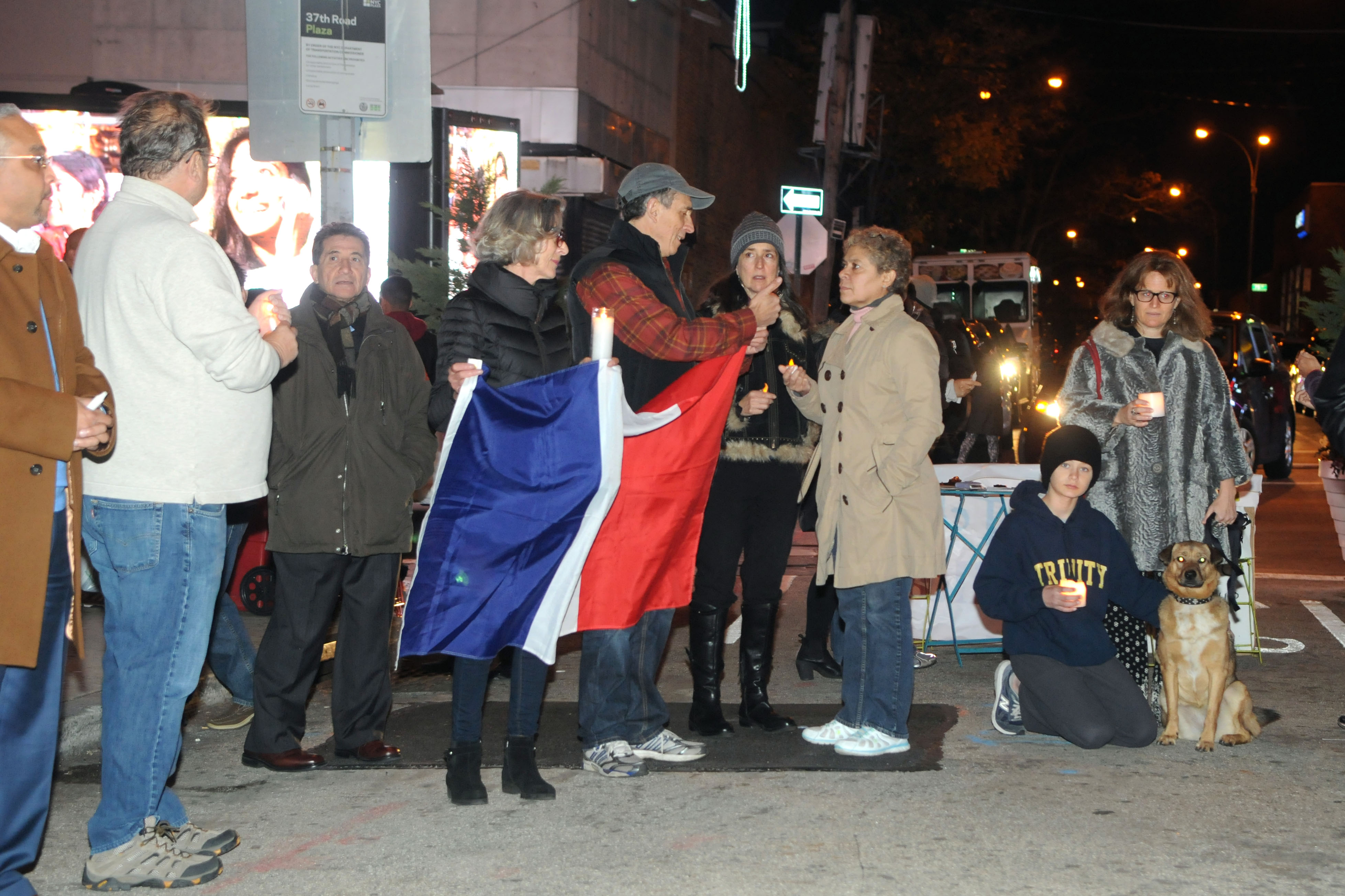 Queens residents gathered at Diversity Plaza in Jackson Heights on Sunday for a candlelight vigil to honor the victims of the terrorist attacks carried out in Paris on Friday.