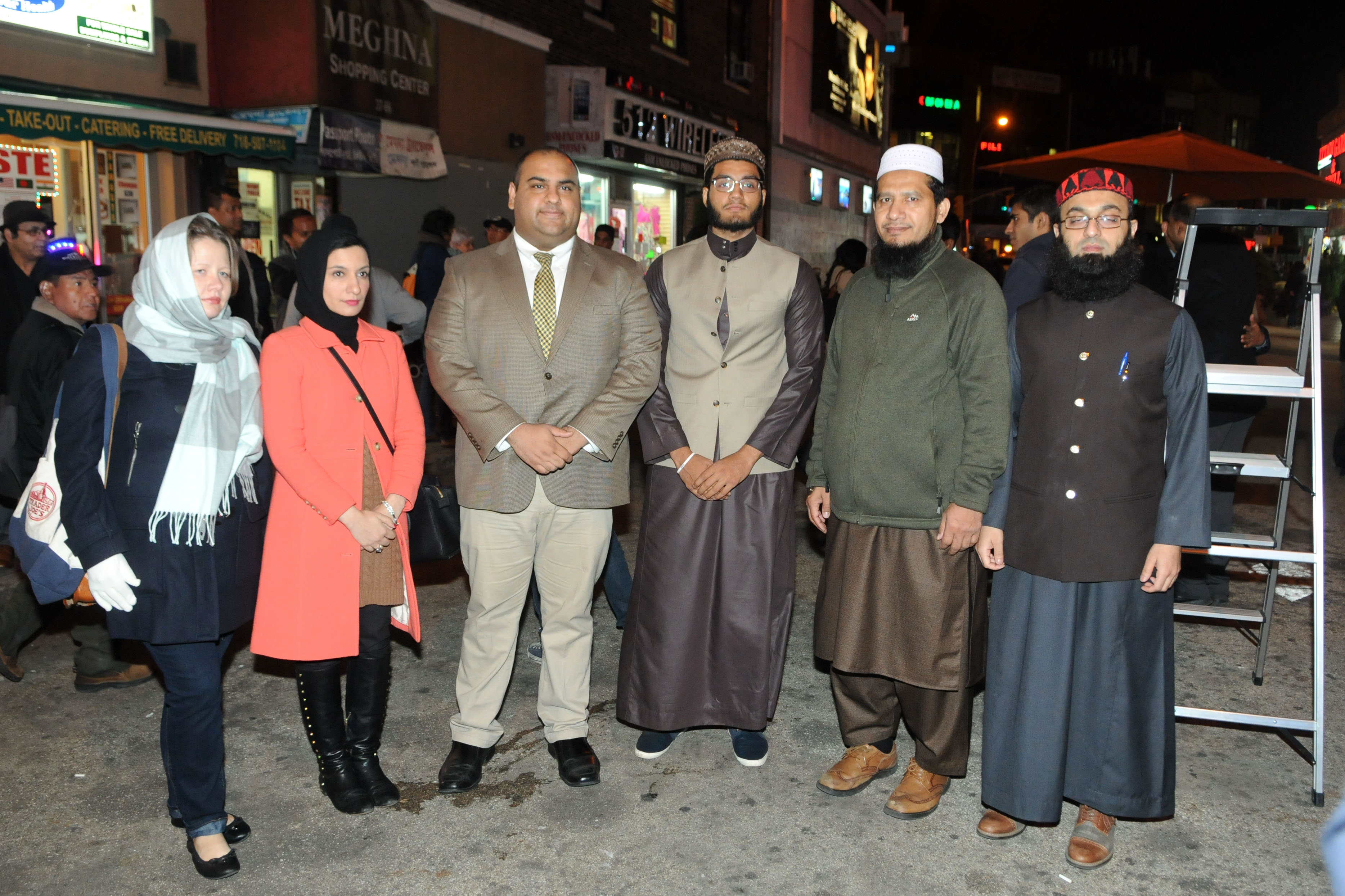 Muslim leaders such as Fahad Hussain of the Muslim advocacy group al Muneer Foundation and Imam Ismail from the Islamic Center of Jackson Heights were also present. Ismail led a prayer in Arabic.