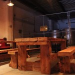 The newly built tap room features rustic farmhouse tables and a large wooden bar, both handmade by Castagna from reclaimed materials. Castagna also constructed the large, wood-paneled brewing kettles that line the back of the brewery and overlook the bar, exemplifying the brewery’s motto of “DIY, self-built, low-tech, bomb-proof.”