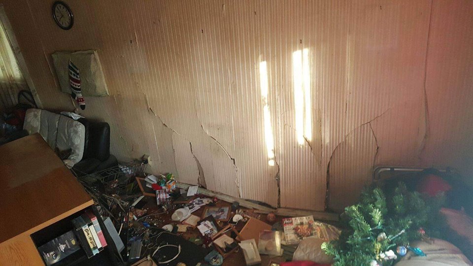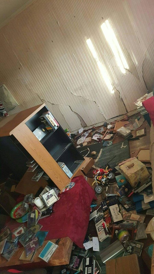 Inside the living area, visible cracks were created as the walls of the home were strained to the breaking point. Broken glass particles, family memorabilia and other items were scattered throughout the area as wall unit and framed photos tumbled to the floor.