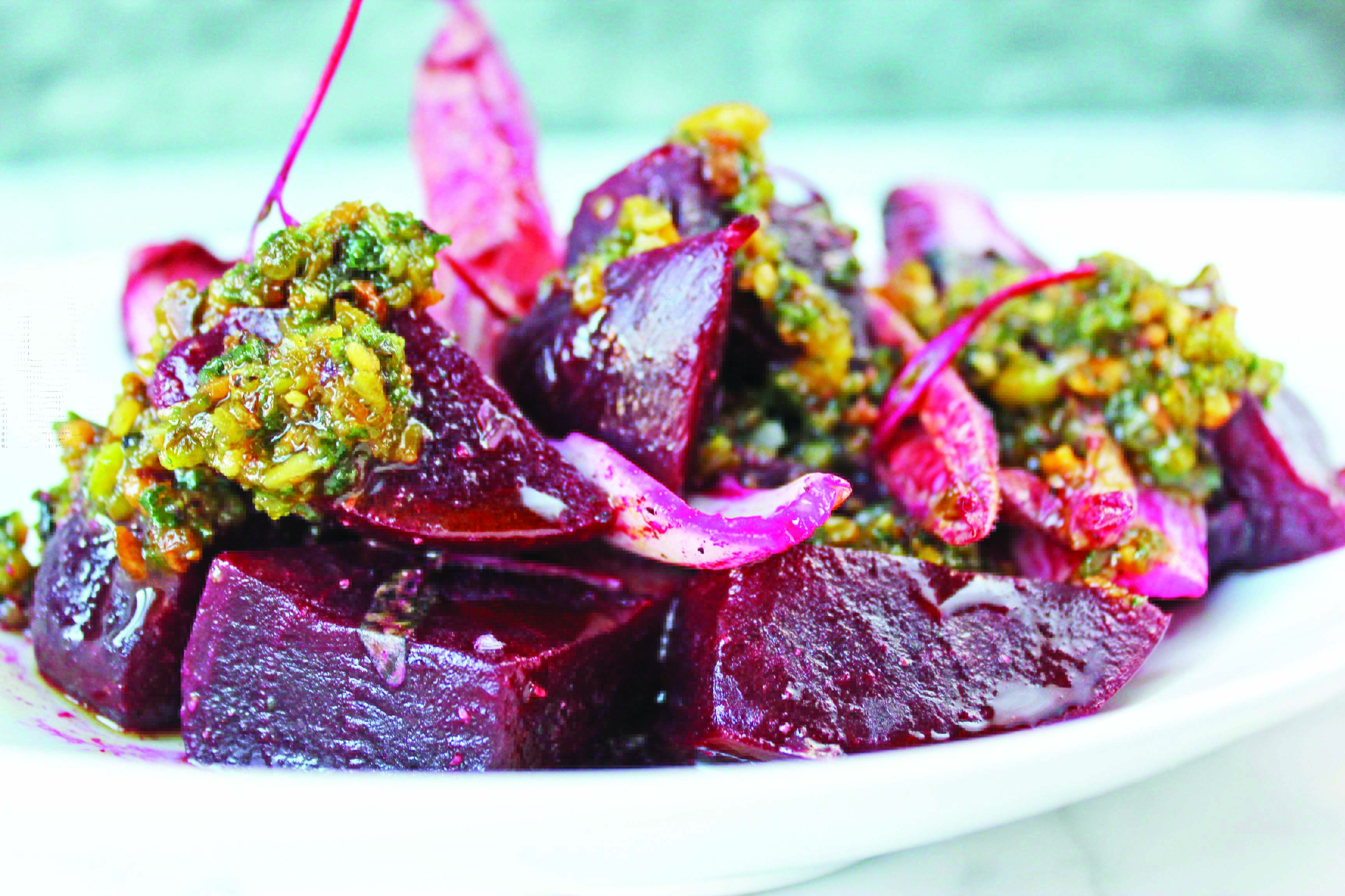 Begin with a board of homemade pickled radishes and chicken liver pâté, whole grain mustard or wagyu smoked beef tongue with black garlic for sharing. Roasted beets dressed with pistachio and pesto offer an earthy but light reprise as a second course. A salad of bitter green frisée dressed with smoked croutons and anchovy vinaigrette is astonishingly vibrant.