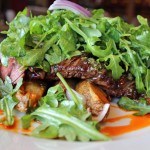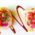 Service begins with a basket of warm pita and whole chickpeas tossed with minced onions in olive oil. A beginning course of sushi is a great one for sharing—perhaps the baja roll, a maki of shrimp tempura and fresh tuna topped with an umami miso tomato salsa, crispy wonton flakes and a drizzle of eel sauce.