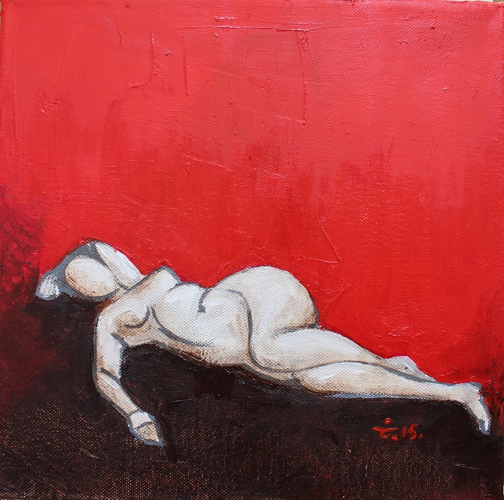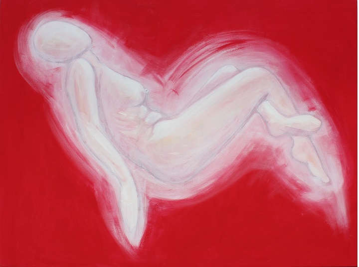 For her display at the Agora Gallery, Fejzullaj works in oils and acrylics on canvas, creating images of both women and men in which her bold take on color, texture and composition turns that mystery into something thought-provoking. Fejzullaj does not use faces to give her subjects a distinctive mood and personality; rather, her subjects’ stories are told through body positioning, lines and backgrounds that range from dense patterns of drips and energetic brushstrokes to fields of solid color.