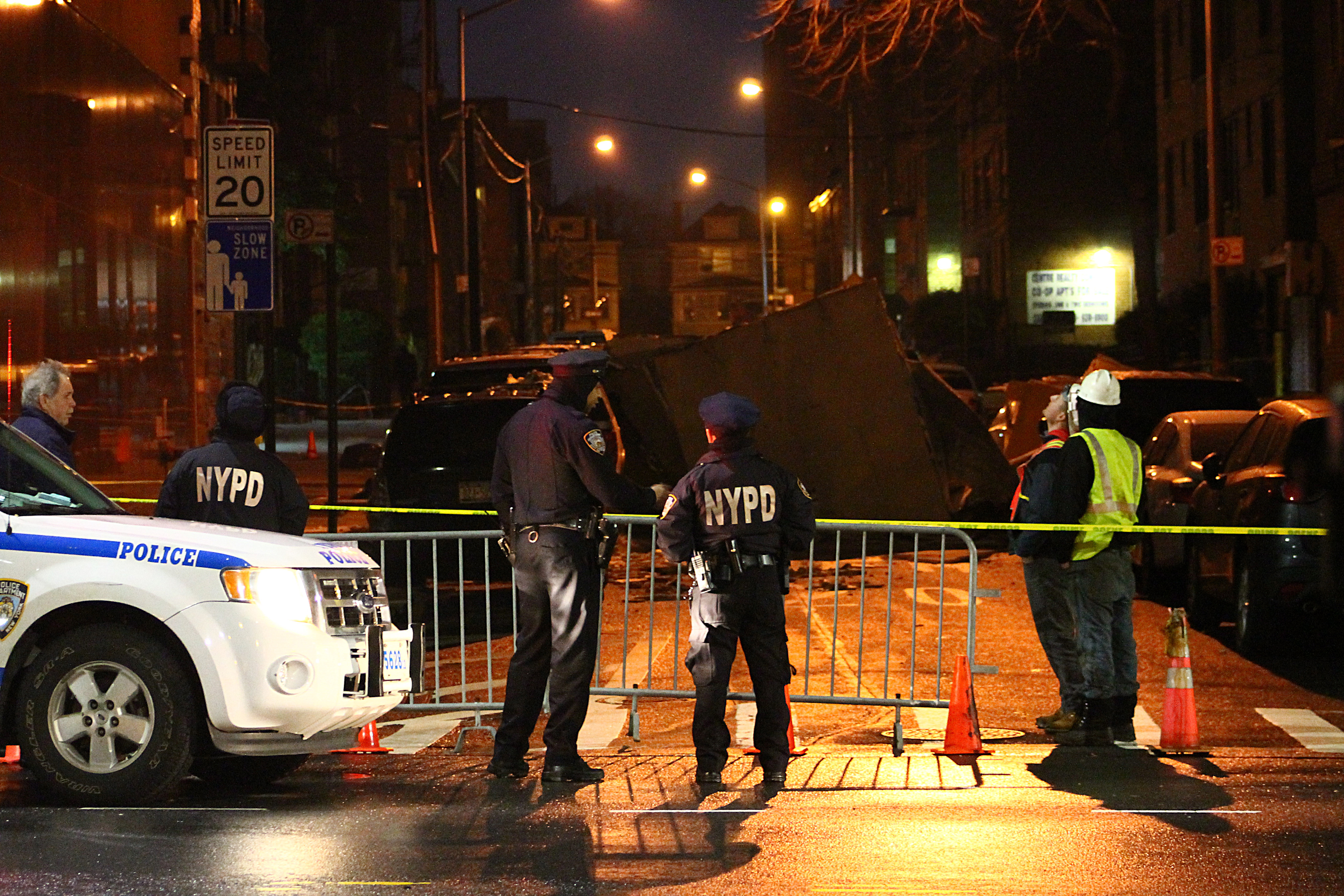 A huge outer portion of a Verizon building in Elmhurst collapsed onto the street below early Thursday morning after a long night of torrential rain and windstorms.