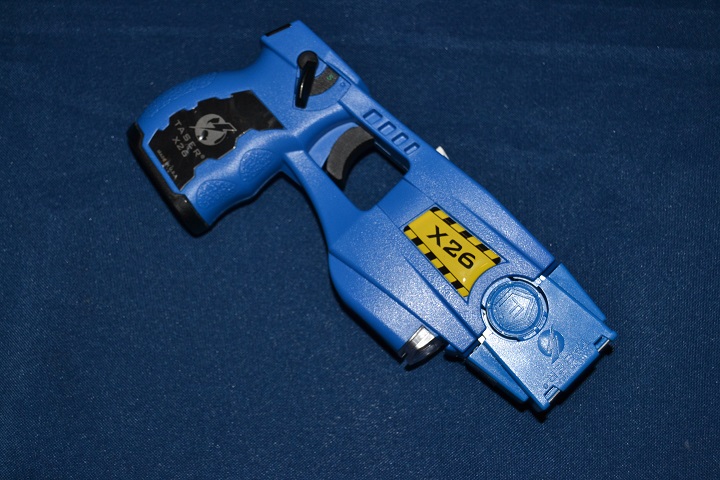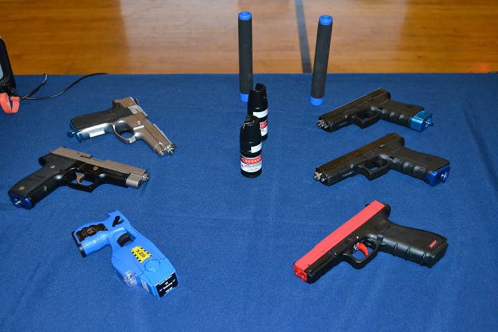 The simulation also uses a modified taser gun and pepper spray canister as options to subdue the perpetrator.