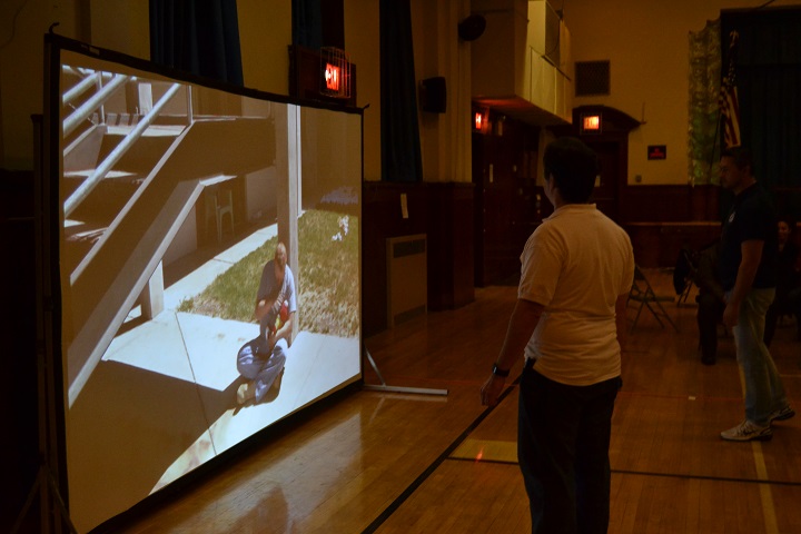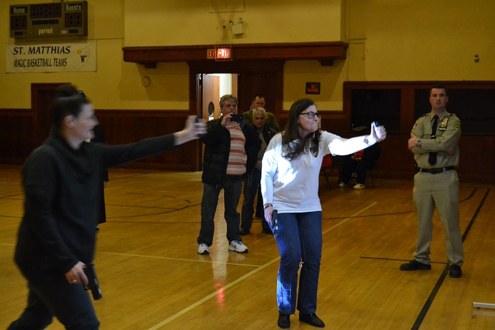 Residents at Tuesday’s 104th Precinct Community Council meeting in Ridgewood got a chance to make split-second, life-or-death decisions by using the Firearms and Tactics Simulator (FATS) with the assistance of officers from the NYPD Firearms and Tactics Section.