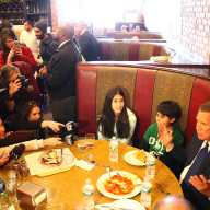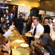 The candidate also got a chance to shake hands with diners — potential voters in New York’s presidential primary on April 19 — and even worked behind the counter for a bit, helping the owners serve slices to waiting customers.