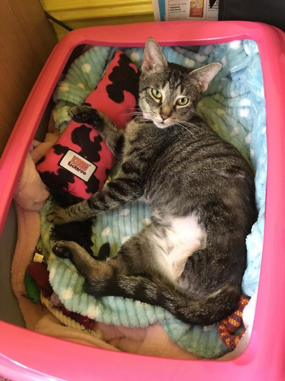 The cat’s wound on her hind leg exposed muscle and bone, and an X-ray showed bones in Shamrock’s belly, which occurs when cats scavenge for food in the trash. Shamrock had surgery to remove the bones, but her leg had to be amputated, the report said.