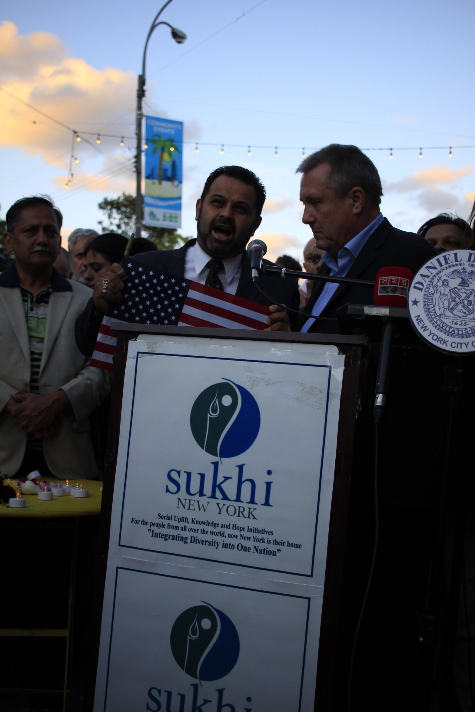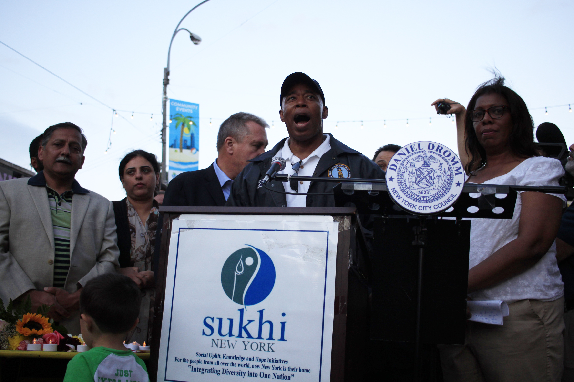 Brooklyn Borough President Eric Adams delivered strong words against individuals who might use the shooting to exploit divisions while stoking fear of Muslims. Adams said that New Yorkers “have an obligation to defend the hyphen” that brings diverse communities together as Americans and explicitly called out the divisive rhetoric of Republican presidential candidate Donald Trump. He called on the citizens gathered to “separate the acts of violence from Islam” so that “voices of tolerance will cascade.”
