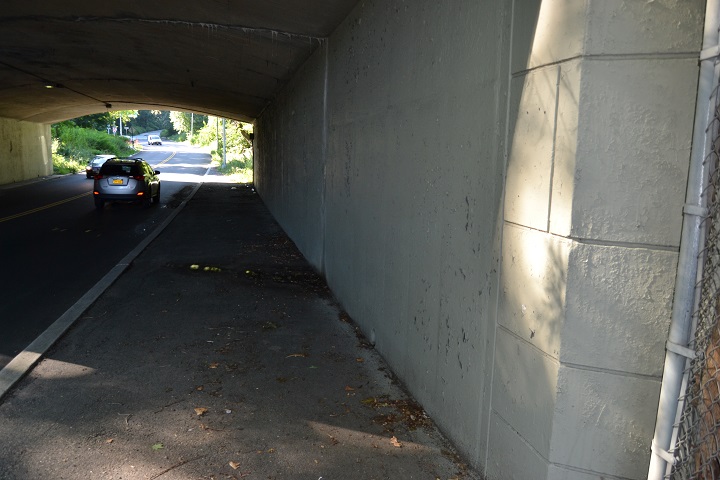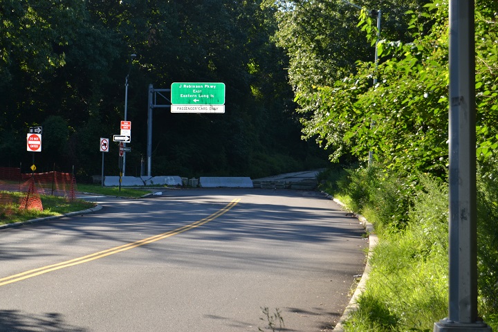 The current entrance at that location is little more than a concrete walkway going under the Jackie Robinson Parkway overpass that transforms into an extremely narrow dirt path, before tapering off into shrubbery and bushes. Pedestrians can barely make their way down to the entrance of the park, which is blocked off my massive barriers to prevent vehicles from entering Forest Park.