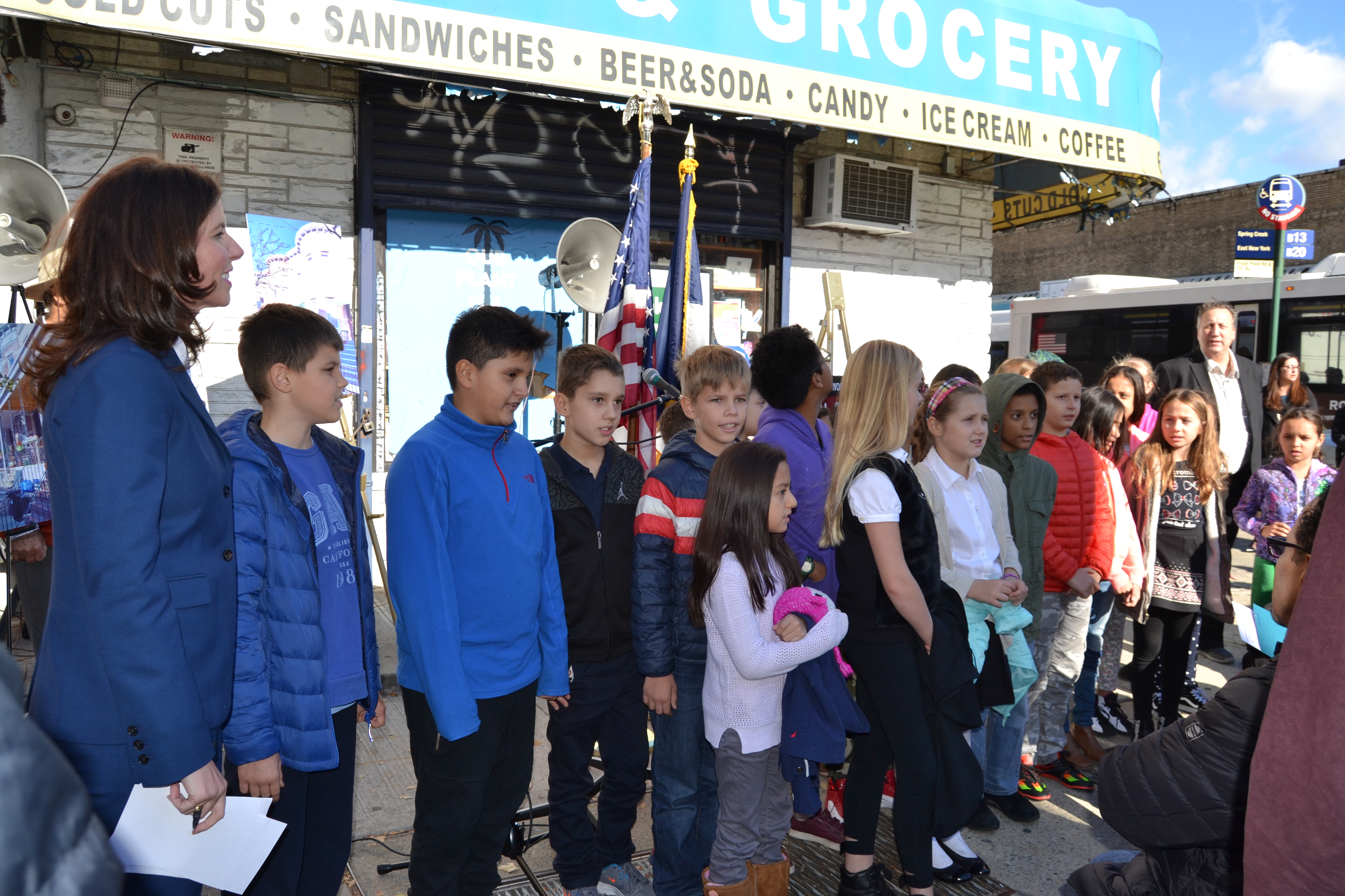 On hand to celebrate the event was Councilwoman Elizabeth Crowley, Councilman Antonio Reynoso, members of Community Board 5 (CB 5), Landmarks Preservation Commission (LPC) Chair Meenakshi Srinivasan, New York Landmarks Preservation Foundation Chair Christina Davis, Ridgewood Property Owners and Civic Association (RPOCA) President Paul Kerzner, Executive Director of the Ridgewood Local Development Corporation (RLDC) Ted Renz, and students from P.S. 88, who led the crowd in the Pledge of Allegiance and a rendition of “God Bless America.”