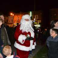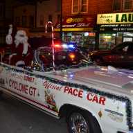Santa Claus pulled up to the church just after 6 p.m. in a Mercury Comet Cyclone GT — decked out by the East Coast Car Association with holiday lights, tinsel, candy canes and bows — ringing his bell and lugging his bag of goodies for all to enjoy as children lined up along the sidewalk to greet him.
