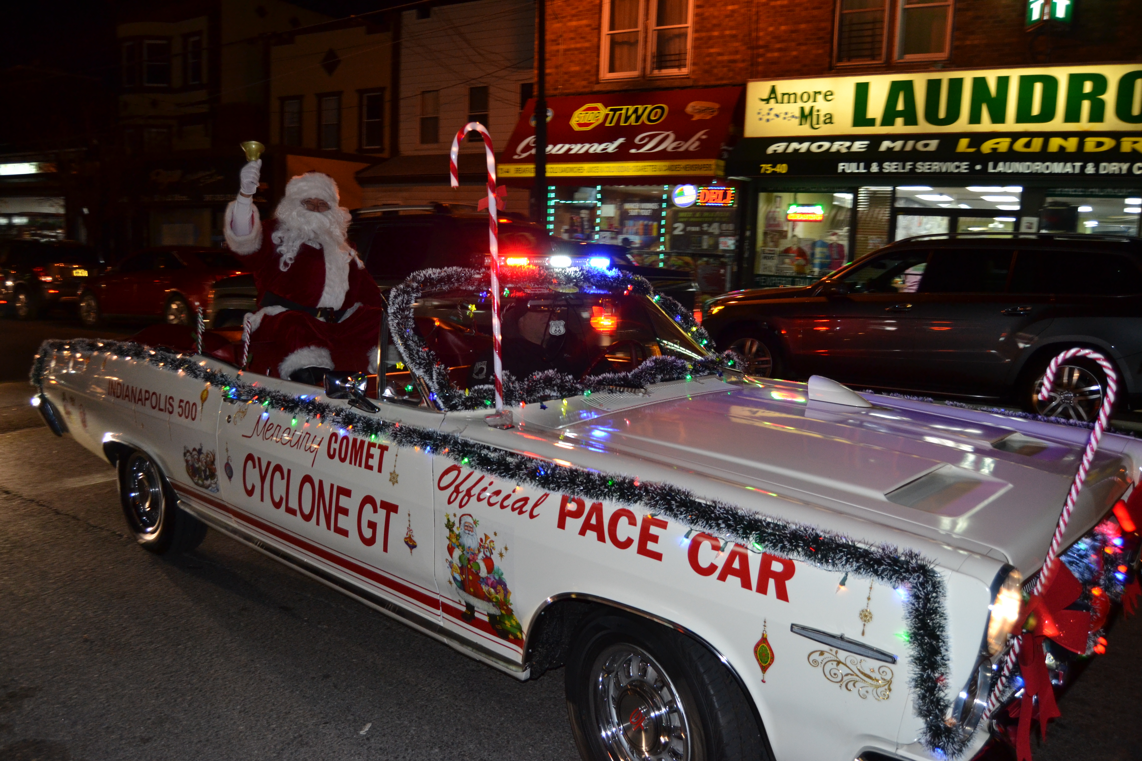 Santa Claus pulled up to the church just after 6 p.m. in a Mercury Comet Cyclone GT — decked out by the East Coast Car Association with holiday lights, tinsel, candy canes and bows — ringing his bell and lugging his bag of goodies for all to enjoy as children lined up along the sidewalk to greet him.