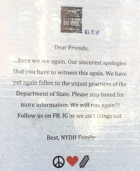 The Dog House owners wrote on the poster that the restaurant has “yet again fallen to the unjust practices of the Department of State.”