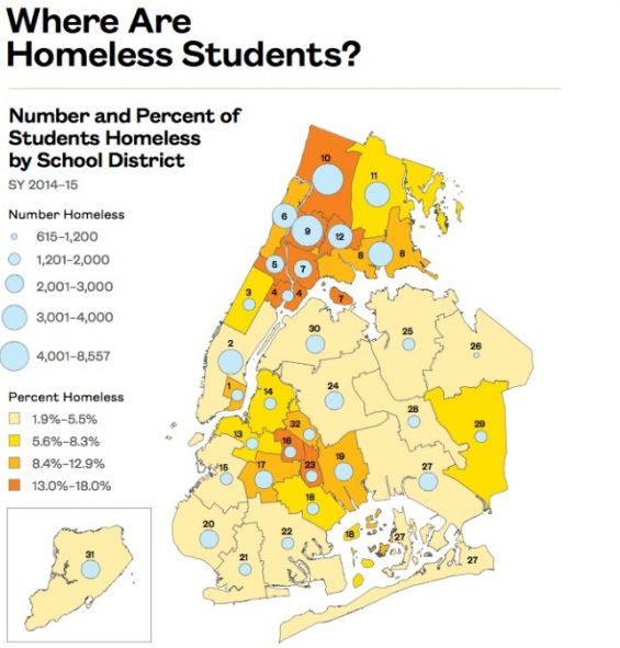 The organization released a map breaking the data down by school, which “provides a detailed picture of homelessness within the City’s educational system: where homeless students go to school, what kinds of supports they may need, what their academic outcomes look like, what differences exist by the type of homelessness a student experiences, and what the lasting impacts of homelessness are educationally—even after a student’s housing instability has ended,” the report explains.