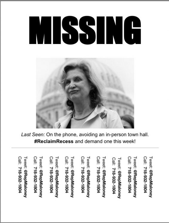 The LIC Opposition group focuses specifically on concrete actions to local politicians whose districts include Long Island City accountable and push them towards a more progressive agenda. Last month, the group hung “Missing” signs, asking to locate Maloney and Senators Kirsten Gillibrand and Chuck Schumer, who had not yet held town halls in the area to speak with constituents.