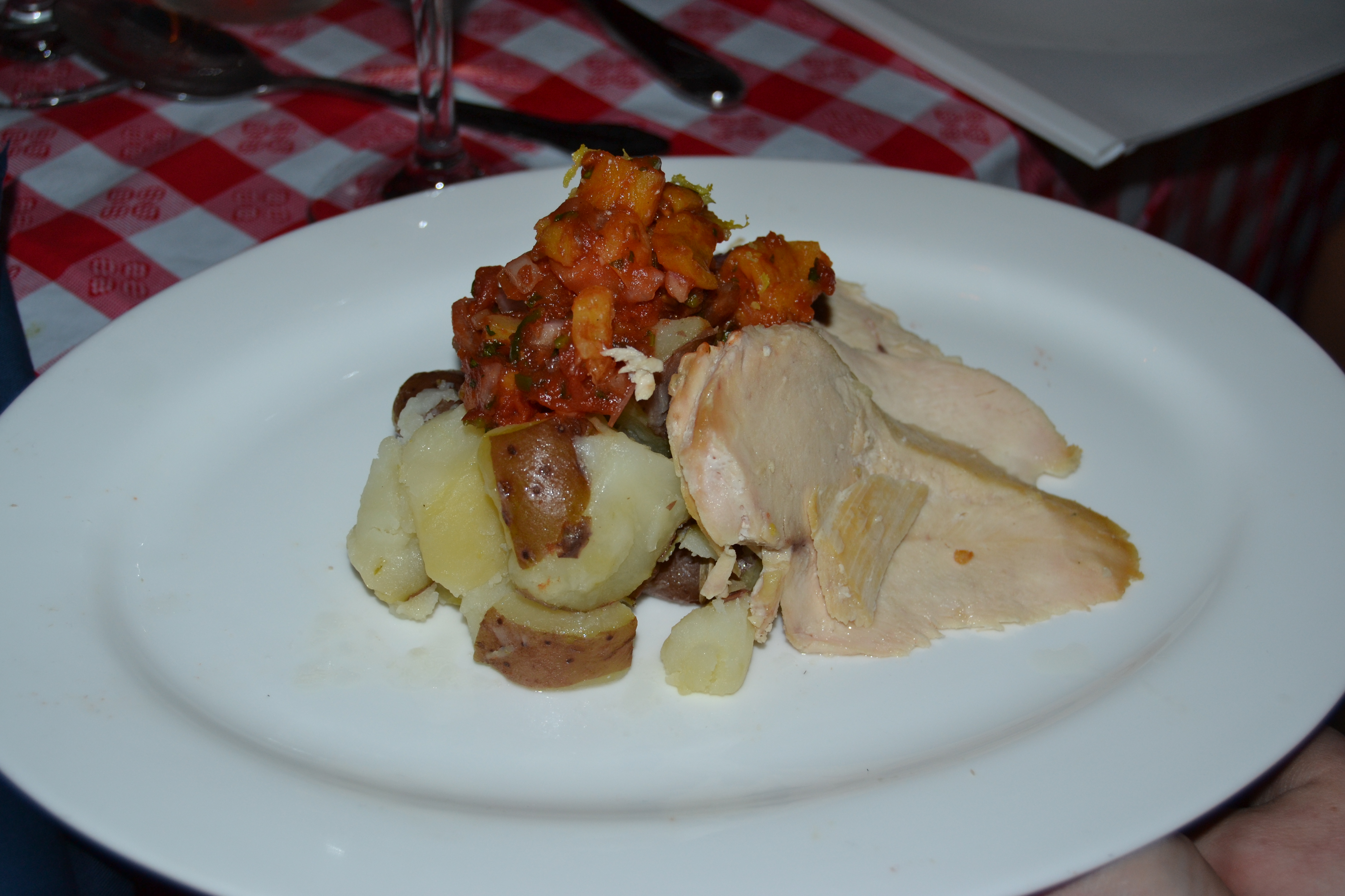 The main course was the “Mother Clucking Chicken,” which was sliced chicken breast topped with an apricot ginger salsa (which had the CBD in it), and new potatoes. The chicken was moist and tender, and the salsa added a splash of color and sweetness to the dish.
