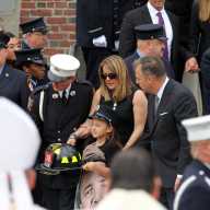 Leading the procession was Tolley’s Ladder Company 135, including one in black and purple bunting carrying his American flag-draped casket. Tolley’s widow and daughter followed the casket into the church as hymns blared.